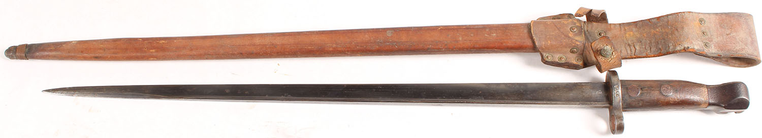 Dutch, Alexander Coppel of Solingen Germany, M1895 Mannlicher bayonet with sheath & frog. Blade has wear & areas of roughness The left side of the blade is marked Alex Coppel commercial trademark scales, marking is covered by pitting & roughness but is still slightly visible. The right side oi the blade is marked with a crown over ''L'' proof. The right side of the guard is marked ''9318 G''. The leather frog has hardened from age & is starting to crack, the retention strap is also torn. Grade: Very Good + - Value: 70 to 140