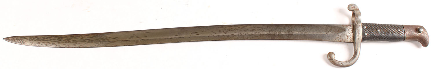 Denmark, Gebruder Weyersberg, M1867 Remington rolling block Yatagan sword bayonet. Blade has spotty patina. Left side of the blade is marked ''GEBR WEYERSBERG'', ''SOLINGEN''. Left side of guard is marked ''47669'', the right side of the guard is marked ''2B498''. This bayonet has a leaf spring catch, and not a coil spring, indicating production prior to 1884. Grade: Very Good + - Value: 80 to 160