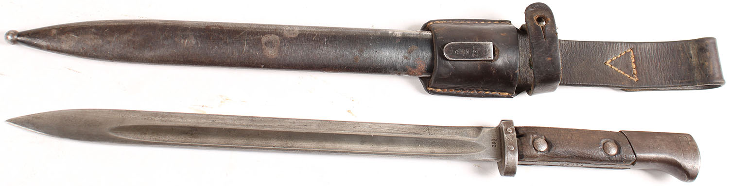 German/Czech, S 24(t) (VZ 24), bayonet with sheath & frog. Blade is bare steel with a few spots of patina, the edge has a few mall chips. The left side of the blade is marked ''CSZ'', & the right side is marked ''E'' small logo ''24''. The right grip has five grooves etched into it, possible kill notches. The S 24(t) model, is the name of captured Vz 24 bayonets that have had their muzzle rings cut off, & used in the German army, during the occupation of Ceskoslovenska. The left over stockpiles when the country was taken over were modified, & new production ones made at the CZ plant were made to the new standard. This bayonet was produced in the first year of MFG for the VZ 24 bayonets (1924) & was modified to the German standard. Grade: Very Good ++ - Value: 40 to 80