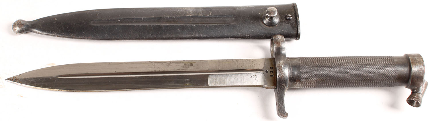 Swedish, Erik Anton Berg AB, M/1896 Bayonet with sheath. The left side of the blade is marked with a crown over ''532''. The right side of the blade is marked ''EAB''. The top of the guard is marked ''EJ'', crown over anchor ''AB'', & a crown proof. the sheath has finish wear & scratches. Grade: Excellent - Value: 30 to 60