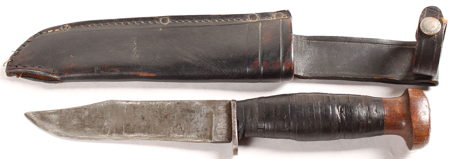 USN Mark 1 knife with sheath, PAL RH35, blade has patina, leather handle. Leather sheath. Grade: Very Good + - Value: 20 to 60