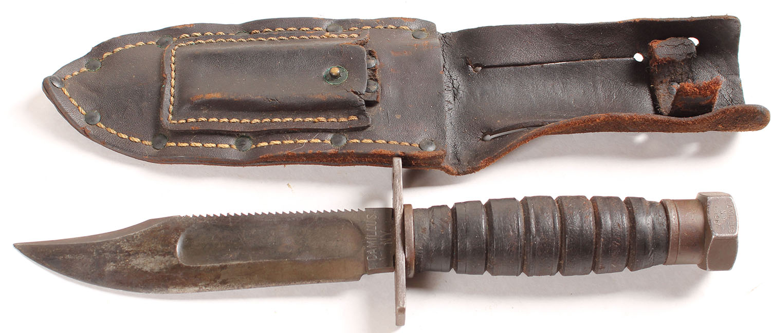 US, Pilot survival knife with leather sheath, Camillus, the left side of the pommel is marked ''CAMILLUS'', ''N.Y.'', ''1-1967''. The left side of the blade is marked ''CAMILLUS''. Handle retention strap on sheath has tore off. Grade: Very Good + - Value: 50 to 100