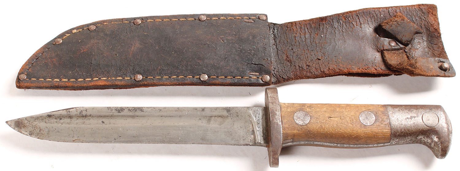 US, Theater made knife from Mauser style bayonet, comes with leather sheath. Grade: Very Good ++ - Value: 20 to 60