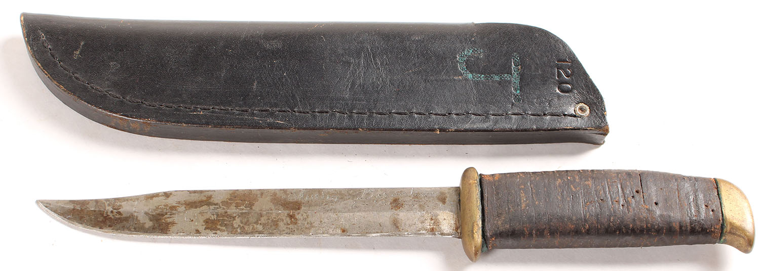 US Theater made knife, blade is marked with a name & date ''SHURLEY DORSCHNER'', ''6-14-1945'', comes with leather pocket sheath - Value: 20 to 60