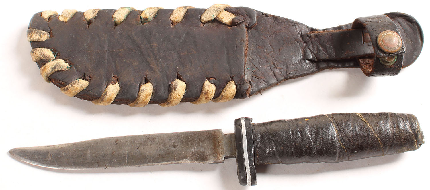 WW2 theater made knife with leather sheath, made from file. rubber/metal guard, cloth wrapped handle. Grade: Very Good + - Value: 8 to 60