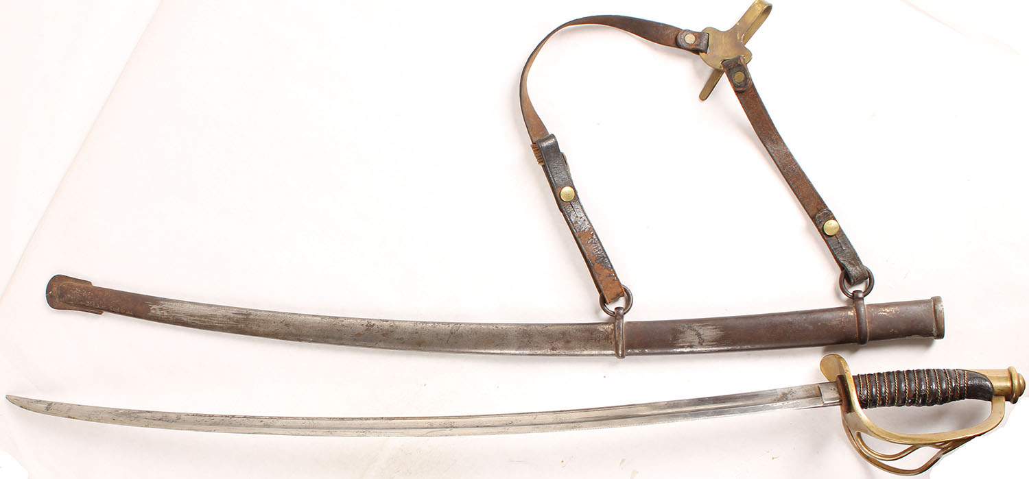 US, M1860 light cavalry saber with scabbard & frog. Blade has spots of patina. The left side of the blade is marked ''NJ'', ''ON'', ''R'', the left side is marked ''U'', ''SC4''. Wire wrapped wood handle, the finish is worn-down in spots. Brass guard & pommel. Scabbard has brown patina & gun metal gray showing in spots. The leather for the frog is still malleable but the coating is cracking & flaking off. Grade: Very Good + - Value: 100 to 300
