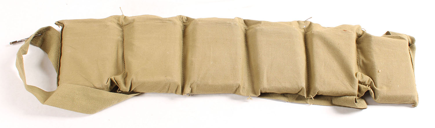 US, 6 Cell Bandoleer, all cells filled with 10 Rds. Of .30-06 on five Rd. steel clips, 60 total Rds.. Ammo is Denver ordnance plant dated 1943. no markings on the bandoleer, ammo is Very good, some Rds. Have light corrosion. Grade: Excellent + - Value: 70 to 140
