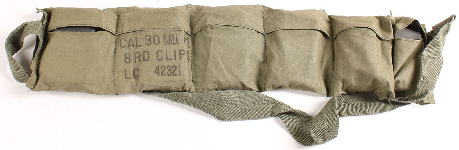US, 6 Cell Bandoleer, all cells filled with 8 Rds. Of .30-06 Ball M2 in 8 Rd. En-bloc clips, 48 total Rds.. Front of bandoleer is marked ''CAL30 BALL M2'', ''8 RD CLIPS'', ''LC 42321'', the back of the bandoleer is marked ''NOV PROD CO'', ''OCT 66''. Ammo is lake city dated 1967, ammo is Very good. Grade: Excellent + - Value: 50 to 100