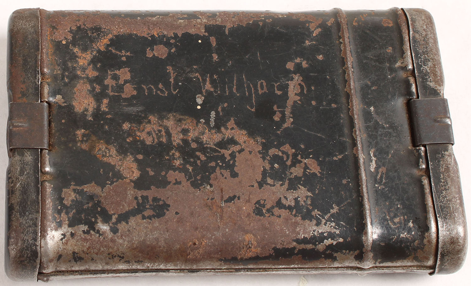 German, WW2 K98k cleaning kit, soldiers name scribed on side ''Ernst Wilharn''. Bottom of case is stamped ''arr 43. Kit has patches, a metal pull through, two brushes & a plastic oil bottle inside. Case has rust & paint flaking. Grade: Very Good - Value: 30 to 90