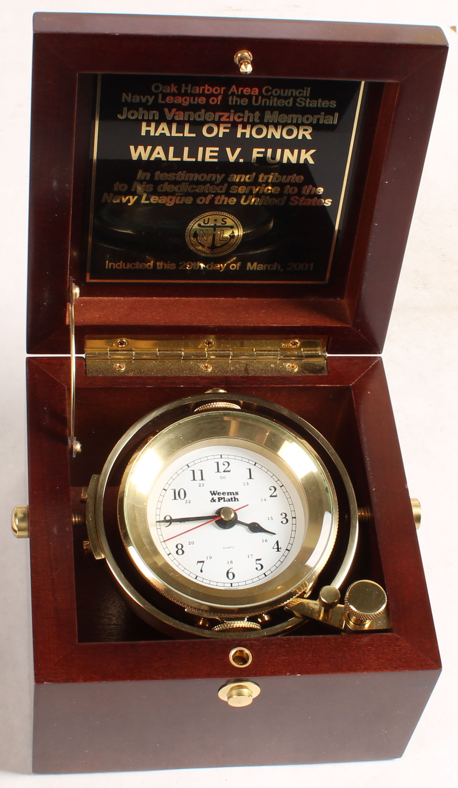 Clock mounted like a ships compass, Oak Harbor Area Council Navy League of the US, John Vanderzicht Memorial Hall of Honor Wallie V. Funk, 2001, enclosed in a cherrywood box, brass clock swivels in all directions, 6'' x 6'' x 4''. Grade: MINT - Value: 20 to 200
