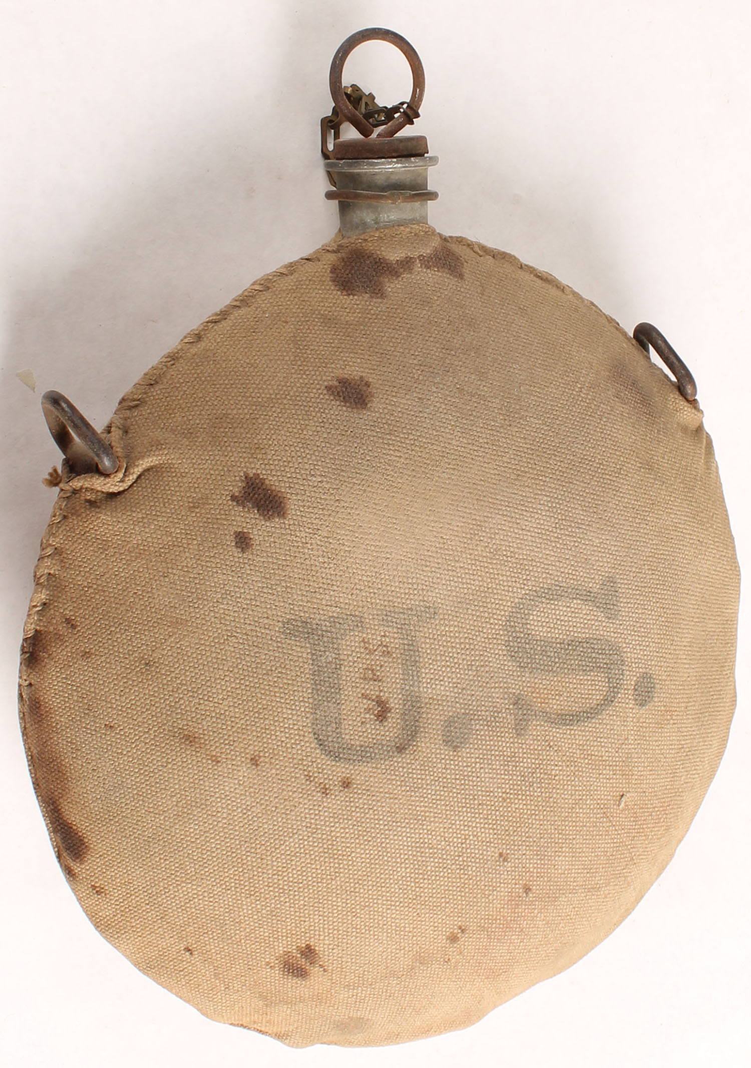 US, M1878 Indian wars canteen, has cork plug, canvas has stains & ''W.P.S.'' written on it, metal parts have rust. Grade: Very Good - Value: 40 to 120