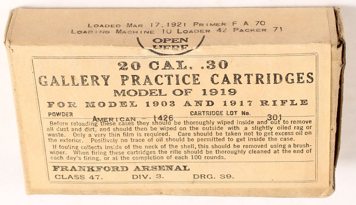 Frankford Arsenal, .30 Cal. Gallery Practice cartridge Model of 1919, loaded march 17 1921, 1pc, FULL & SEALED, buff box & label with black print, box is solid with light handling wear, light wear on bottom from bullets, & very light staining. Grade: Excellent + - Value: 20 to 40