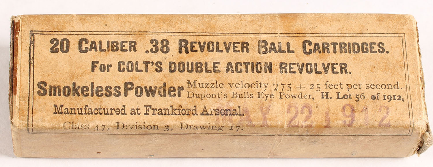 Frankford Arsenal, .38 Revolver Ball, for colts double action revolver, smokeless, dated May 1912, 1pc, FULL & SEALED, buff box & label with black print. The box has light age soiling & rub marks. Grade: Excellent + - Value: 20 to 40