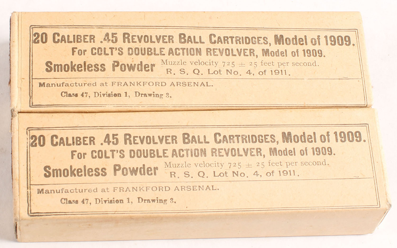 Lot of two, Frankford Arsenal, .45 Revolver Ball, Model of 1909 (.45 Colt), both dated Dec 29 1913, 1pc, both FULL & SEALED, 40 Rds. total, buff box & label with black print, boxes have light age soiling, light rub marks, & light handling wear. Grade: Excellent + - Value: 20 to 40