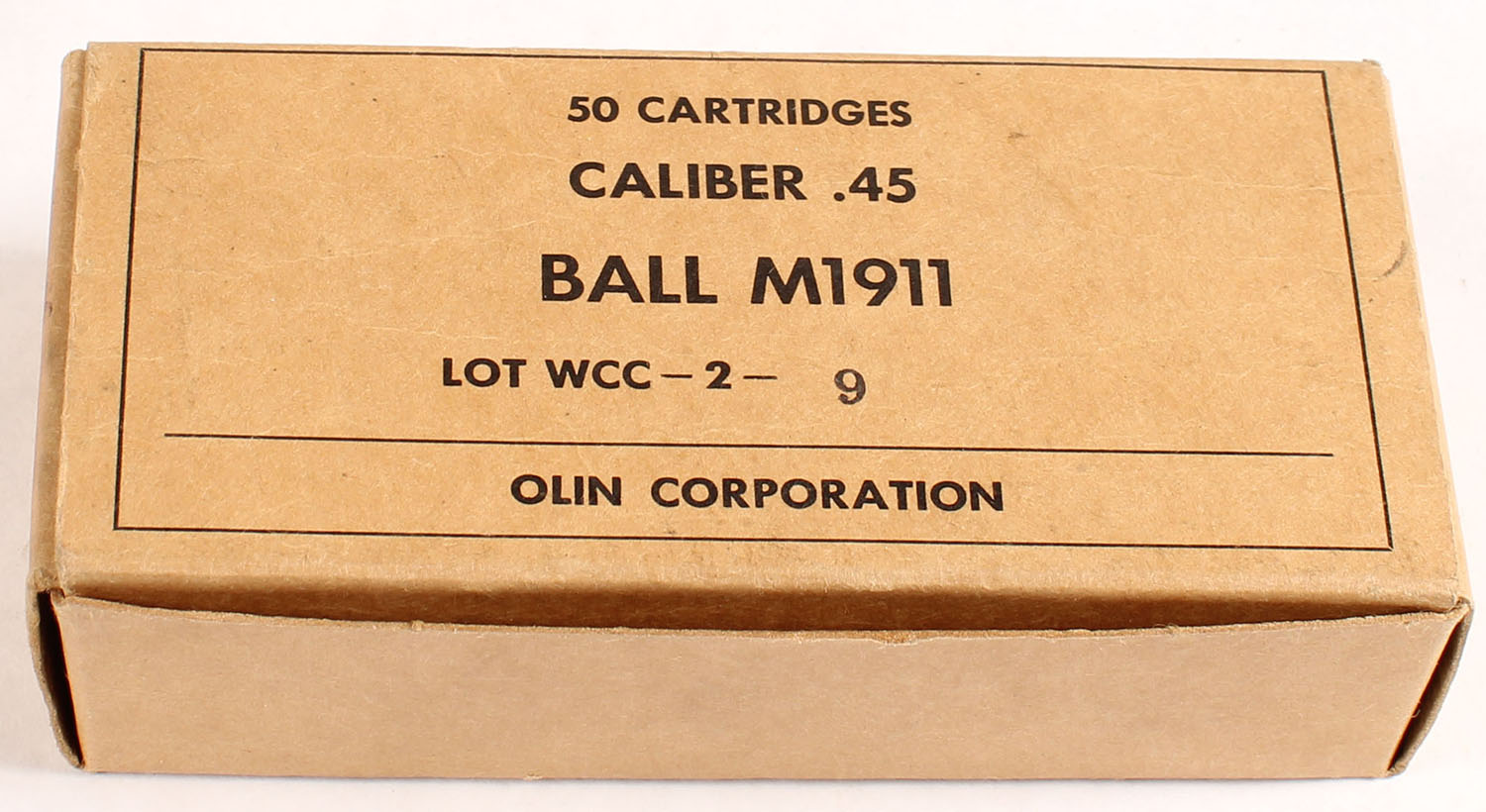 Olin, .45 M1911 Ball, Lot WCC-2-9, 1pc, Full 50 Rd. box, brown box with black print, box is solid with light handling & rub wear, ammo is excellent. Grade: Excellent + - Value: 20 to 40