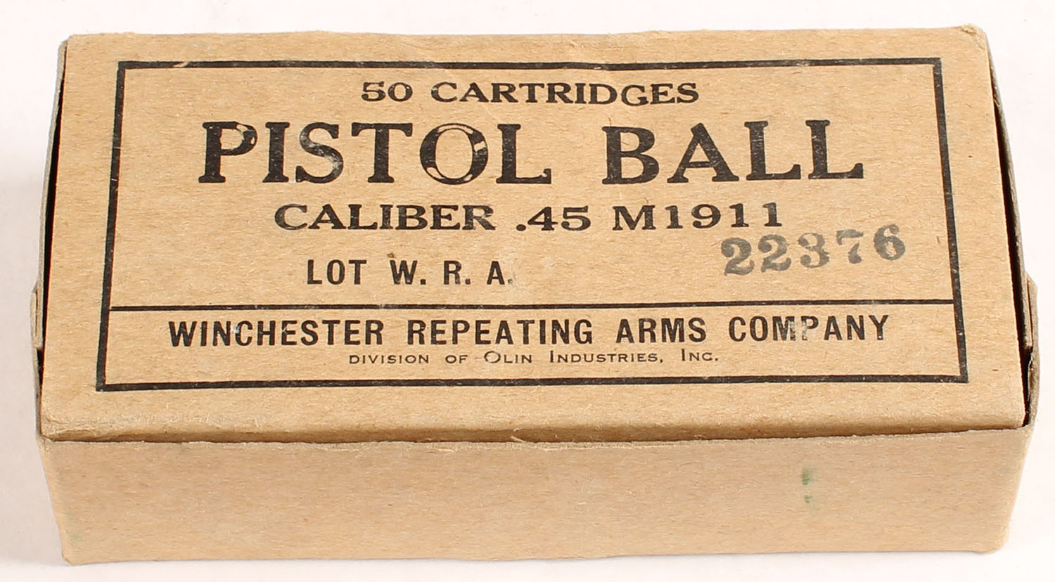 Winchester, .45 M1911 pistol Ball, Lot W.R.A. 22376, 1pc, Full 50 Rd. box, brown box with black print, box is solid with light handling & rub wear, ammo is very good. Grade: Excellent - Value: 20 to 40