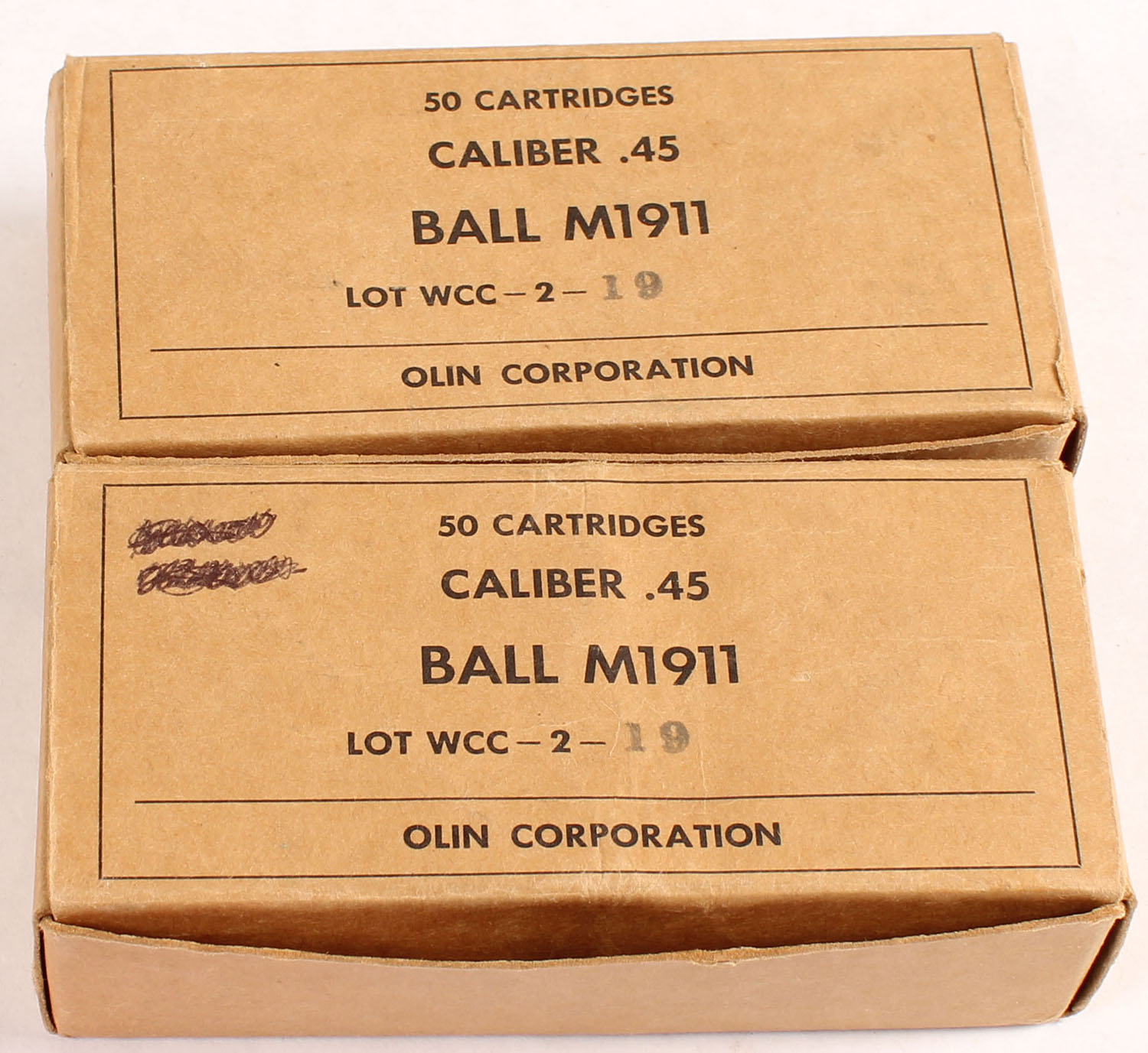 Lot of two, Olin, .45 M1911 Ball, Lot WCC-2-19, 1pc, one full one partial box, 99 total Rds., brown box with black print, box is solid with light handling & rub wear, ammo is excellent. Grade: Excellent + - Value: 40 to 80