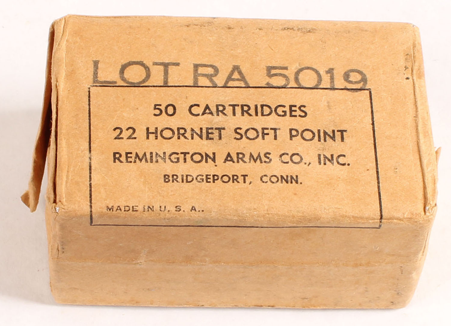 Remington, .22 Hornet soft point, Lot RA 5019, 1pc Foil wrap, FULL & SEALED, brown foil wrap with black print, the wrap has light stains & rub wear. Grade: Excellent + - Value: 50 to 100