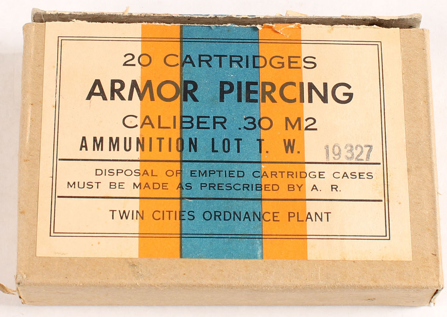 Twin Cities, .30 M2 Armor Piercing, Lot T.W. 19327, 1pc, full, buff box with buff/orange/blue label & black print, box is solid with light rub wear, ammo is excellent to very good. Grade: Excellent + - Value: 40 to 80