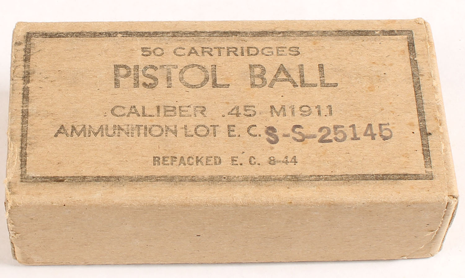Evansville .45 M1911 Ball, steel case ammo, 1pc, FULL & SEALED, brown box with black print, box has rub wear & label fading. Grade: Excellent - Value: 20 to 40