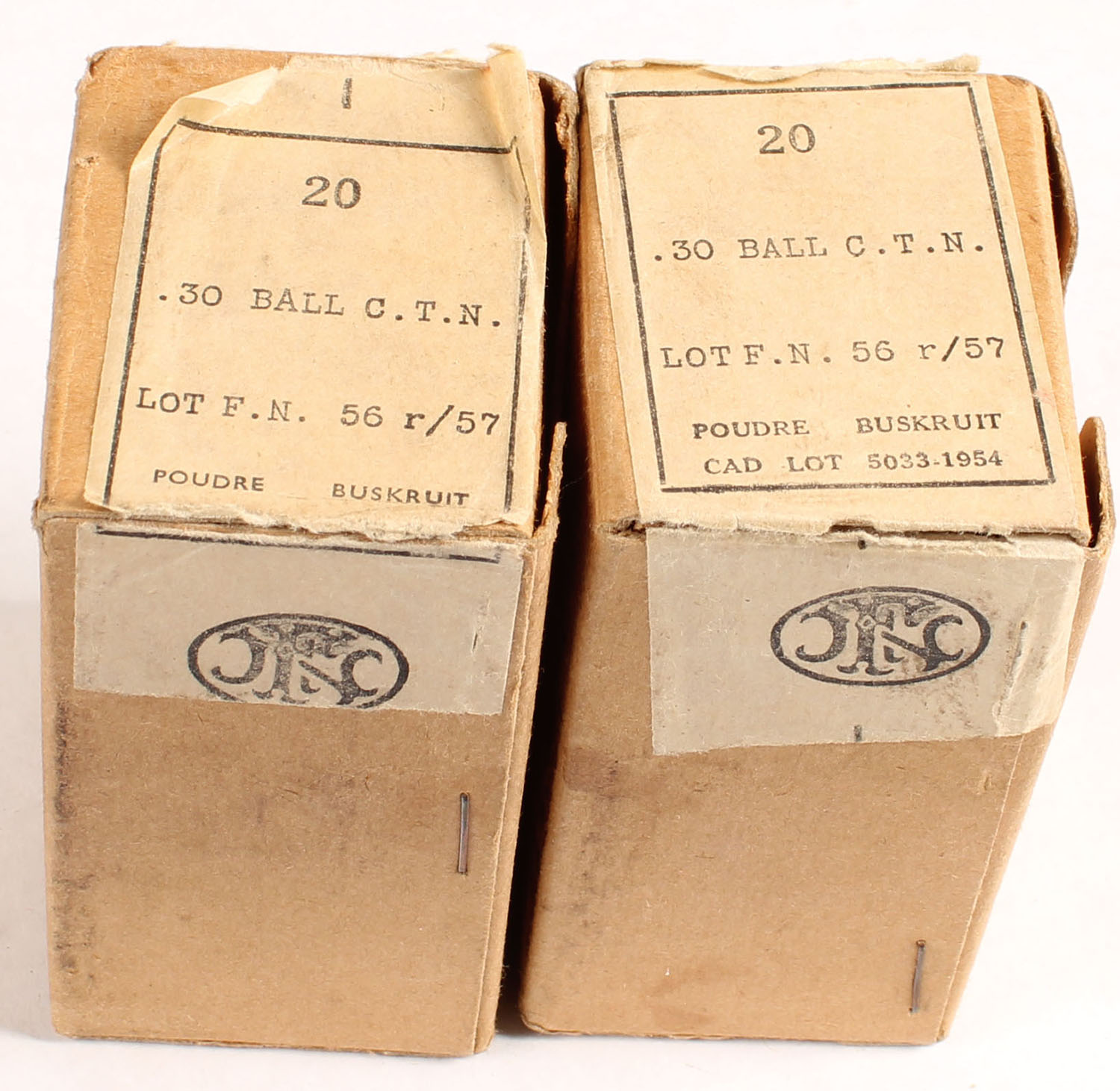 Lot of two, FN, .30 Ball C.T.N. (.30-06), lot F.N. 56 R/57, 1pc, box, both Full, 20 Rd. boxes, brown box with buff label & black print, boxes are solid with rub marks & stains, ammo is excellent & is corrosive. Grade: Excellent - Value: 20 to 40