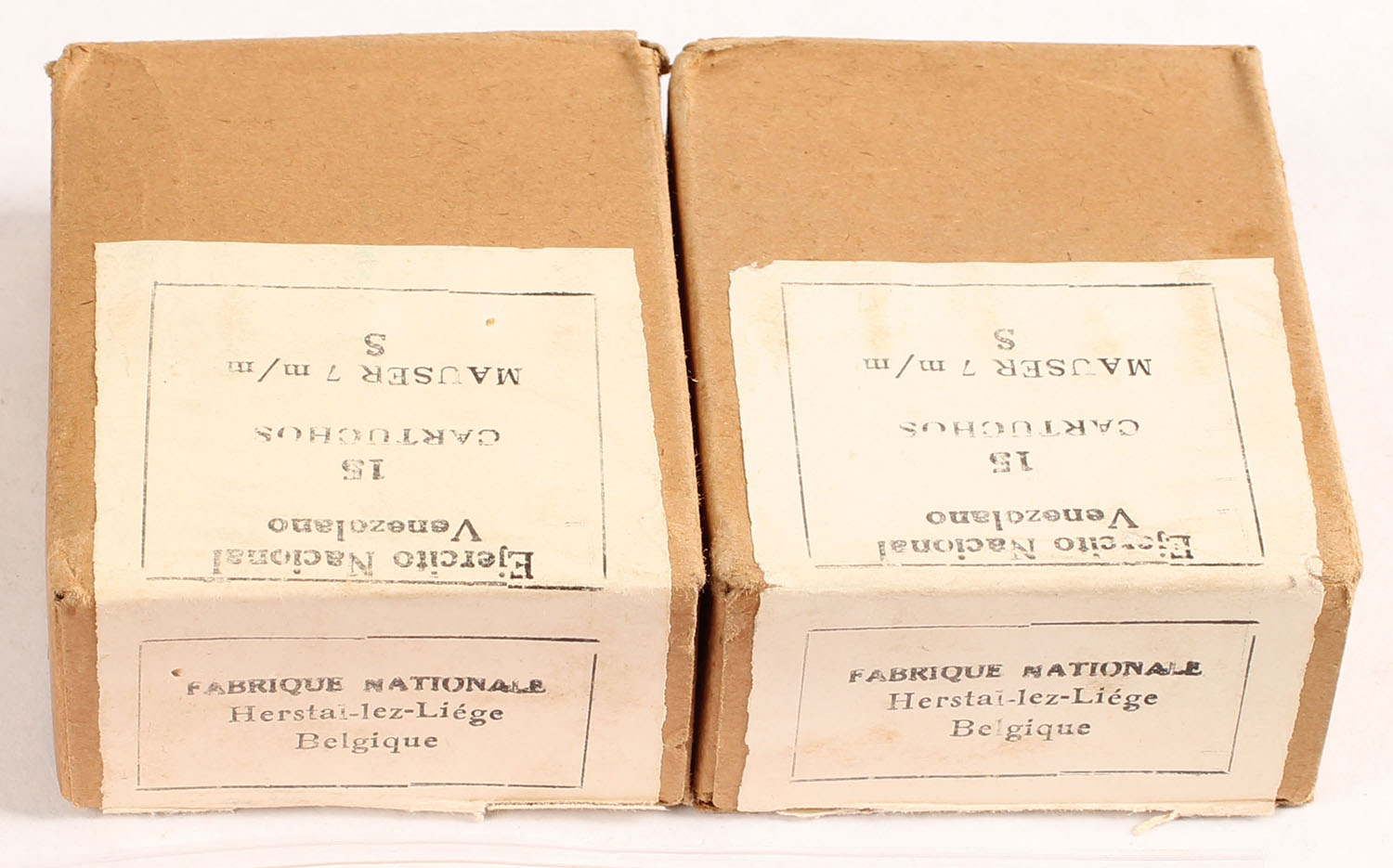 Lot of two, FN Venezuelan Contract, 7x57mm Mauser, on clips, 1pc, Full & partially sealed, 15 Rd. boxes, brown box with buff label & black print, boxes are solid with light wear, one boxes seal is intact & the other is torn but pull strap not torn out. Grade: Excellent - Value: 20 to 40