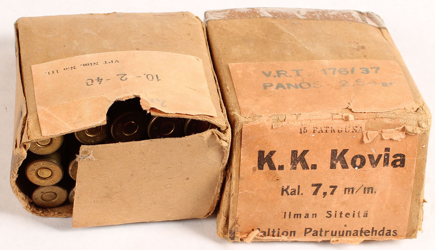 Lot of tow, Finnish V.R.T., 7.7mm K.K. Kovia (.303 British Machine Gun Hard Ball), 1pc, both full, 15 Rd. boxes, brown boxes with red label, one box is missing front label, the other has tape repair, both have age soiling, ammo ranges from very good in one box, & poor in the other. Grade: Very Good - Value: 20 to 40