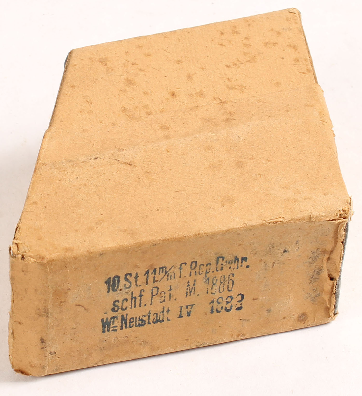 Austrian, 11mm F.Rep Gwhr. Schf.Patr M.1886 (11mm Mannlicher), 10 Rd. box on clips, 2pc, FULL & SEALED, brown box with blue print, box is solid with rub marks & light age soiling. Grade: Excellent + - Value: 10 to 30