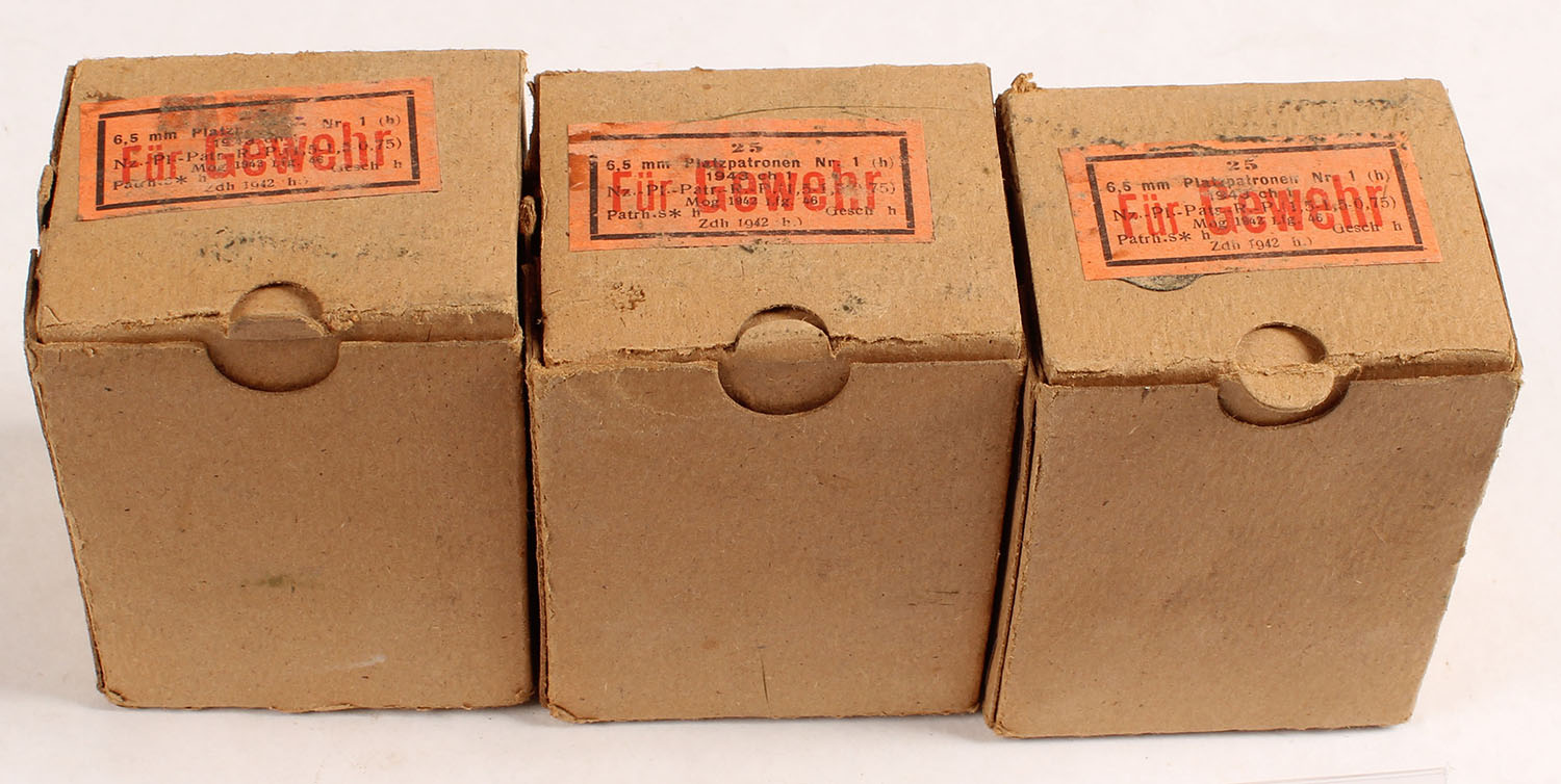 Lot of three, FN/German, 6.5mm Mannlicher wood bullet blanks, on clips, dated 1942. this ammo was made at the FN plant in Belgium while under nazi control by using Dutch once fired cases, German powder, & dutch primers. These were made for the training of troops with captured dutch rifles. 1pc, all full, 25 Rd. boxes, brown boxes with orange label & black/red print, boxes are solid with light wear, ammo is very good. Grade: Excellent + - Value: 30 to 60