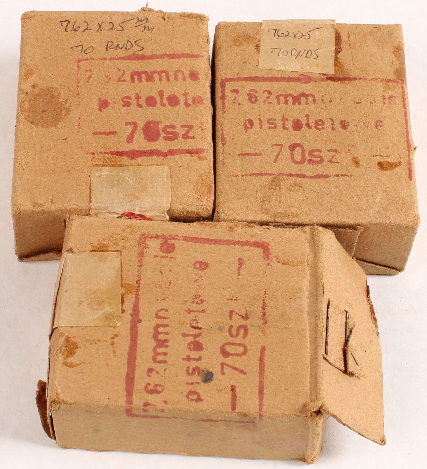 Lot of three, Polish Factory 21, 7.62mm Tokerav, 1pc, all full, two SEALED, 70 Rd. boxes, brown boxes with red print, boxes have rub marks & stains, ammo is excellent in open box & is dated 1955. Grade: Very Good ++ - Value: 70 to 140