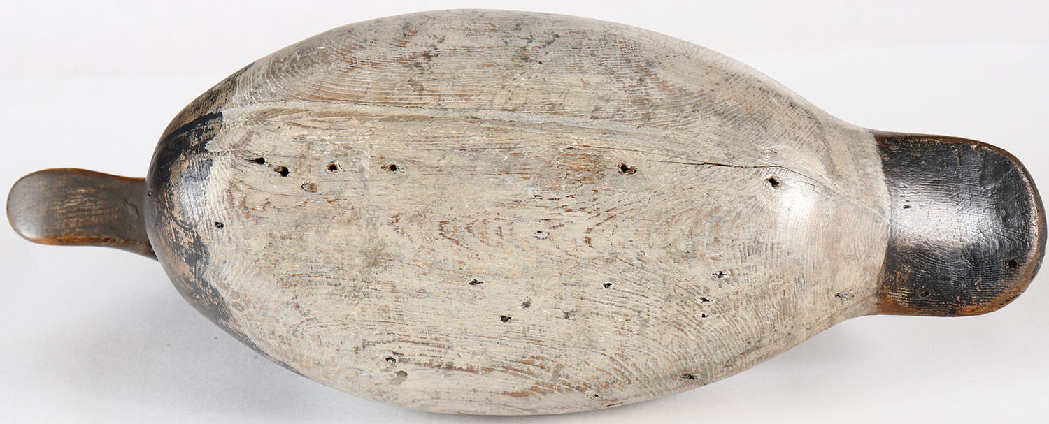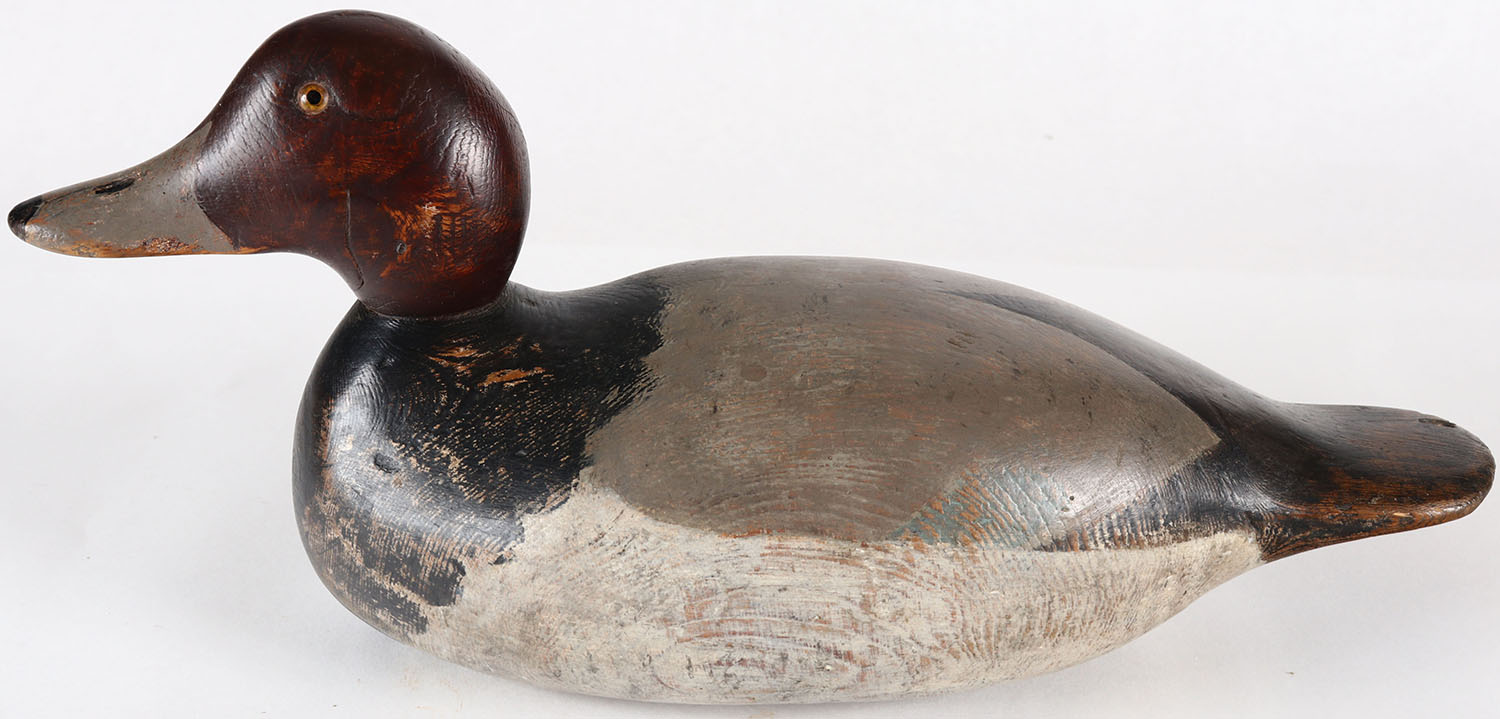 Redhead Drake by Mason Decoy Company, Detroit, MI, 1896-1924, Standard Grade, glass eyes, solid wood, repainted, has a filled age crack on bottom, structurally excellent, 14 1/4''