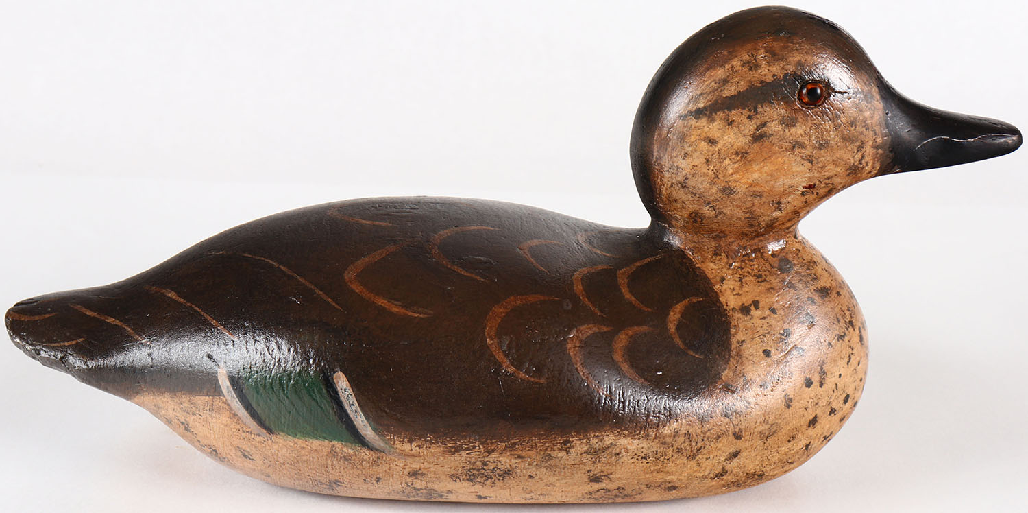 Greenwing Teal Hen by Mason Decoy Company, Detroit, MI, 1896-1924, Standard Grade, glass eyes, solid wood, repainted, structurally excellent, 12 3/4'' OAL. Grade: Excellent - Value: 100 to 200