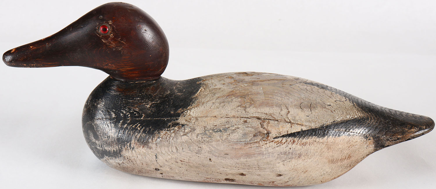 Canvasback Drake by Mason Decoy Company, Detroit, MI, 1896-1924, Standard Grade, glass eyes, solid wood, taken down with repaint, bill tip is blunted, structurally excellent, 15'' OAL. Grade: Very Good ++ - Value: 60 to 100