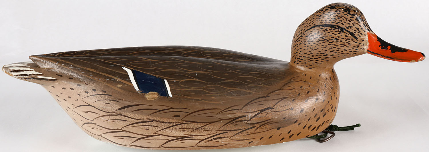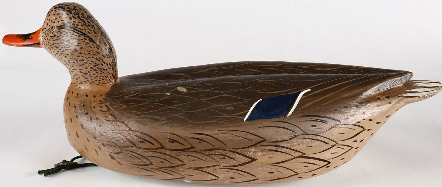 Mallard Hen by Bill William Goenne, King City, CA, glass eyes, hollow wood, original paint, structurally excellent, 20 1/2'' OAL. Grade: Excellent - Value: 100 to 200