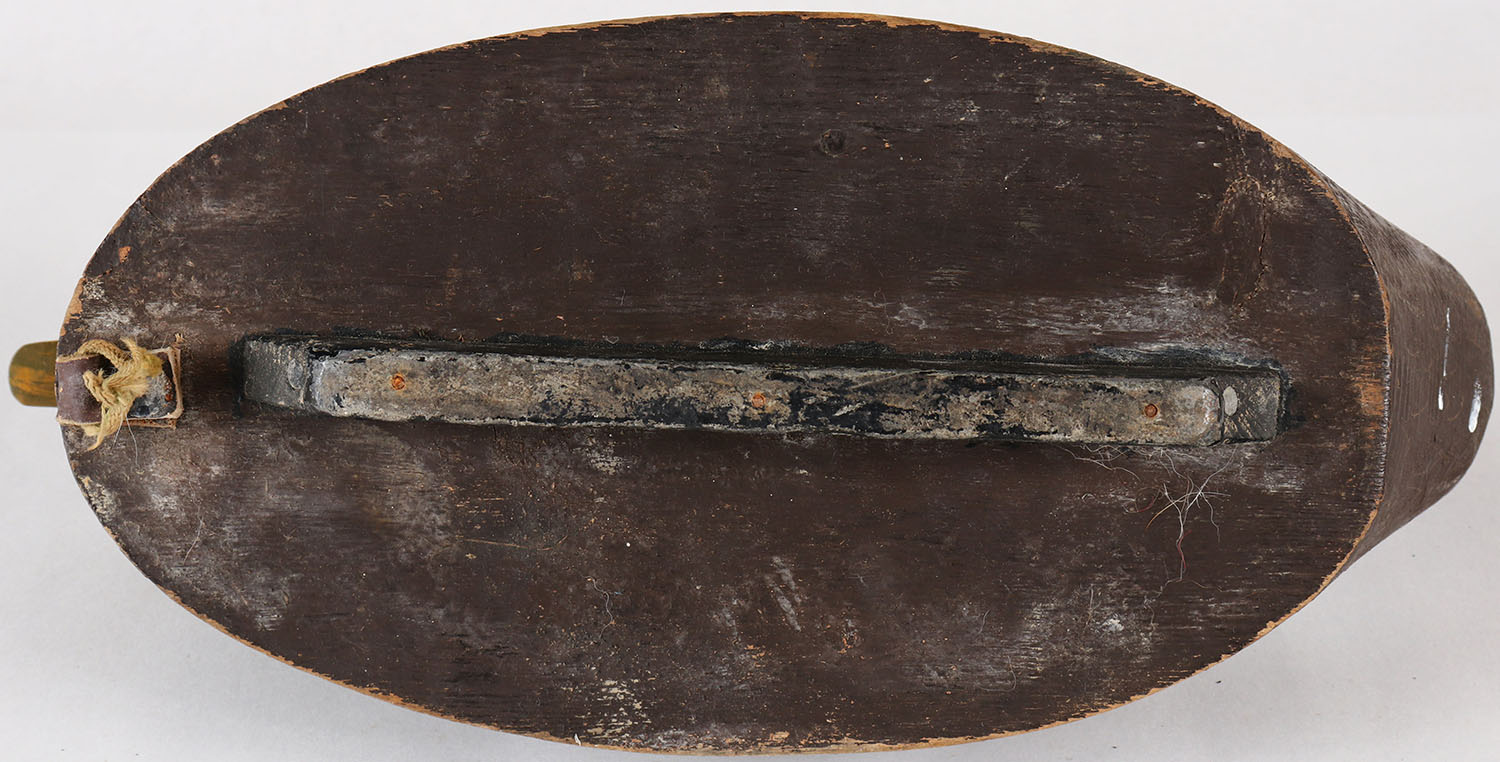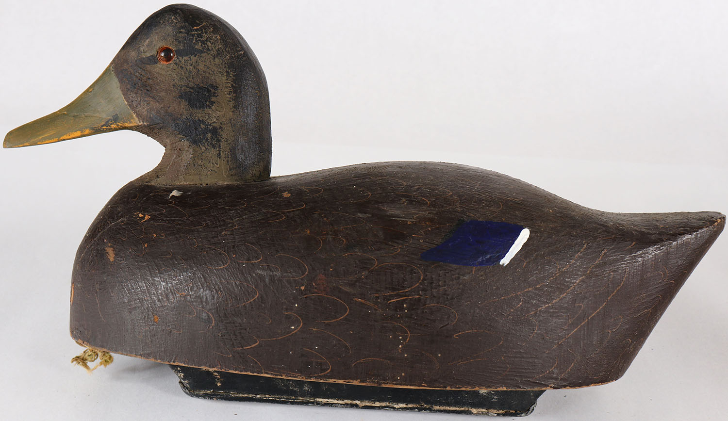 Black Duck by unknown maker, GE, solid wood, original paint on body with repaint to repaired cracked bill, shows some feather detail has keel, 14 3/4'' OAL. Grade: Very Good ++ - Value: 40 to 80