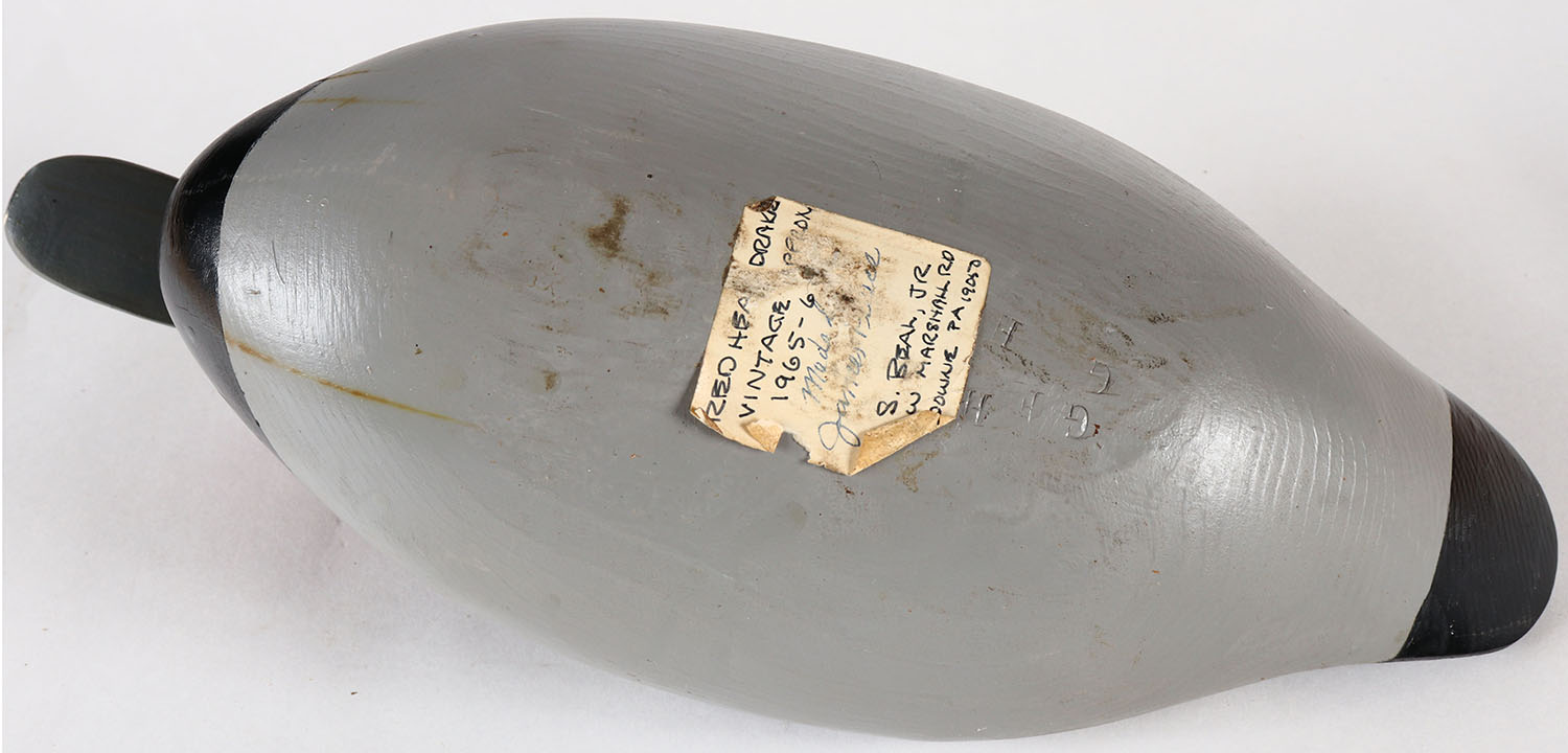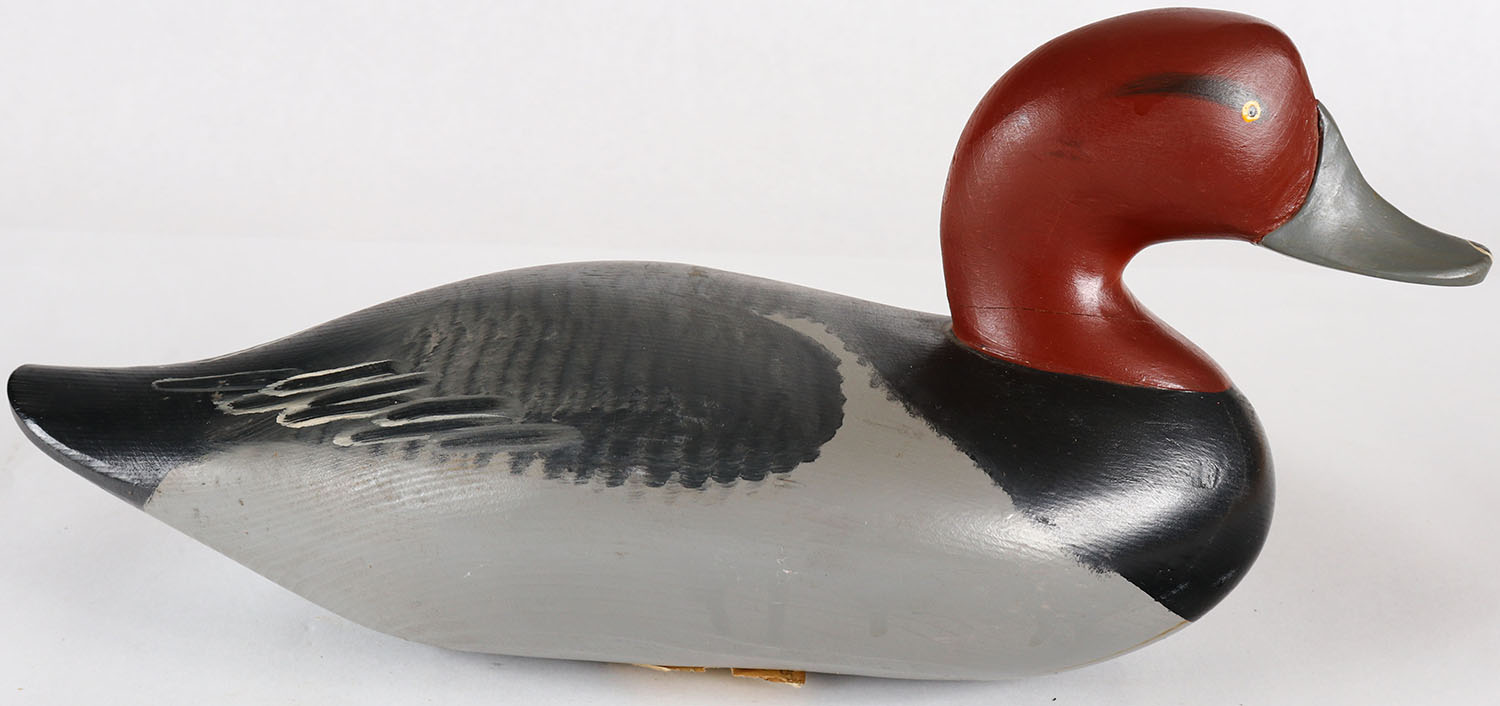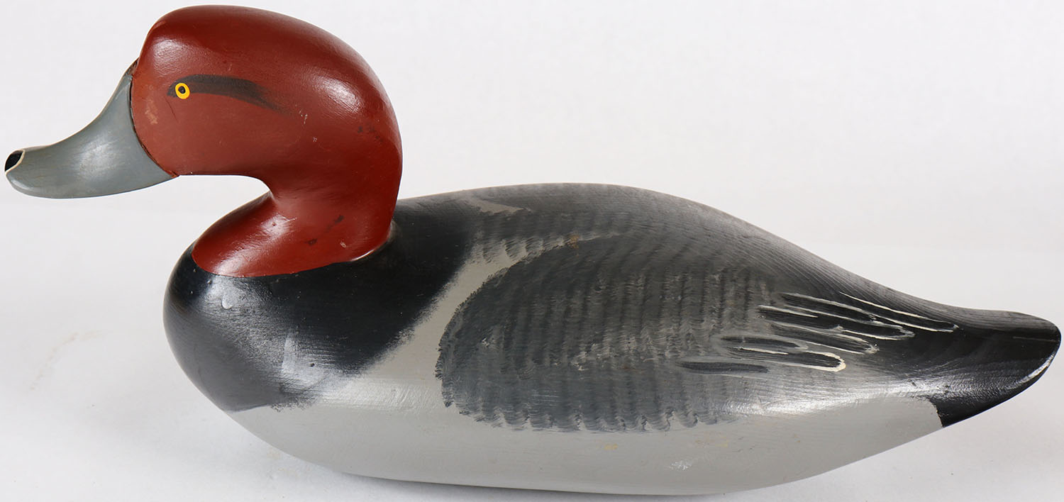 Redhead by Jim Pierce & Son Decoys, Havre De Grace MD, painted eyes, solid wood, structurally excellent, unsigned on bottom, 14 1/2'' OAL. Grade: Excellent + - Value: 50 to 100