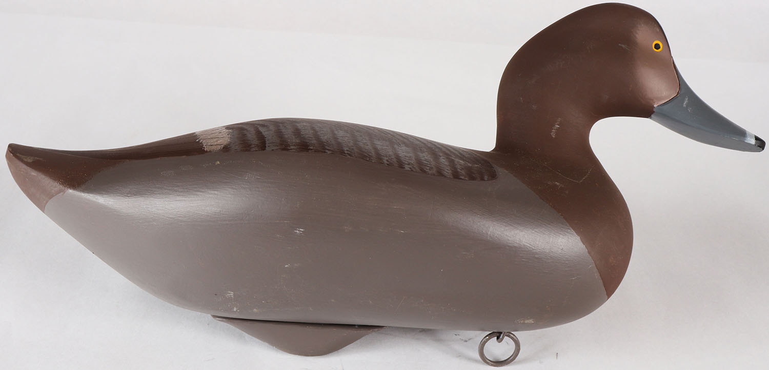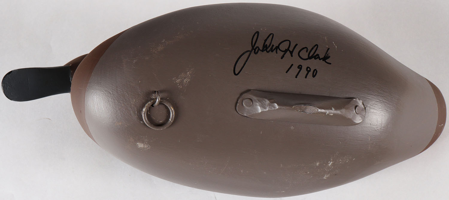 Ringbill Hen by John H. Clark, Havre De Grace, MD, painted eyes, solid wood, original paint, structurally excellent, signed on bottom, 14 1/2'' OAL. Grade: Excellent + - Value: 20 to 40