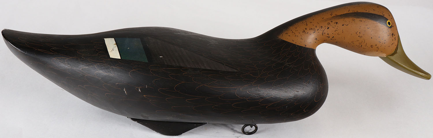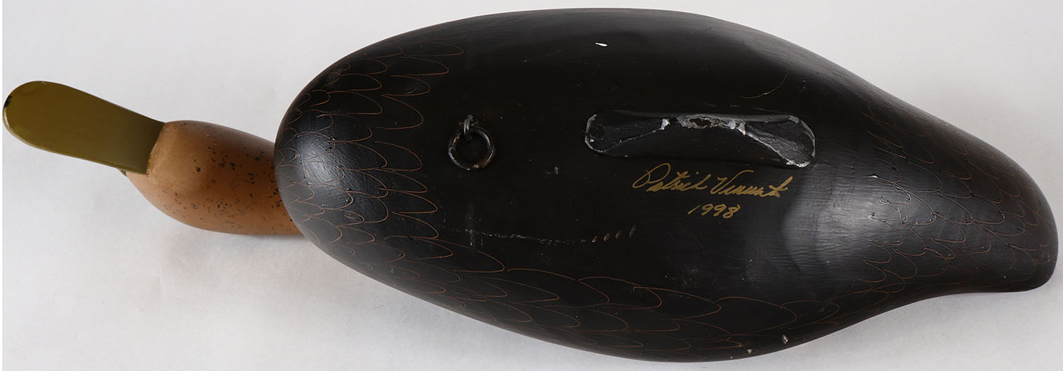 Swimming Black Duck by Patrick ''Pat'' Vincent, Churchville, MD, painted eyes, solid wood, original paint, structurally excellent, signed on bottom, 19'' OAL. Grade: Excellent ++ - Value: 50 to 100