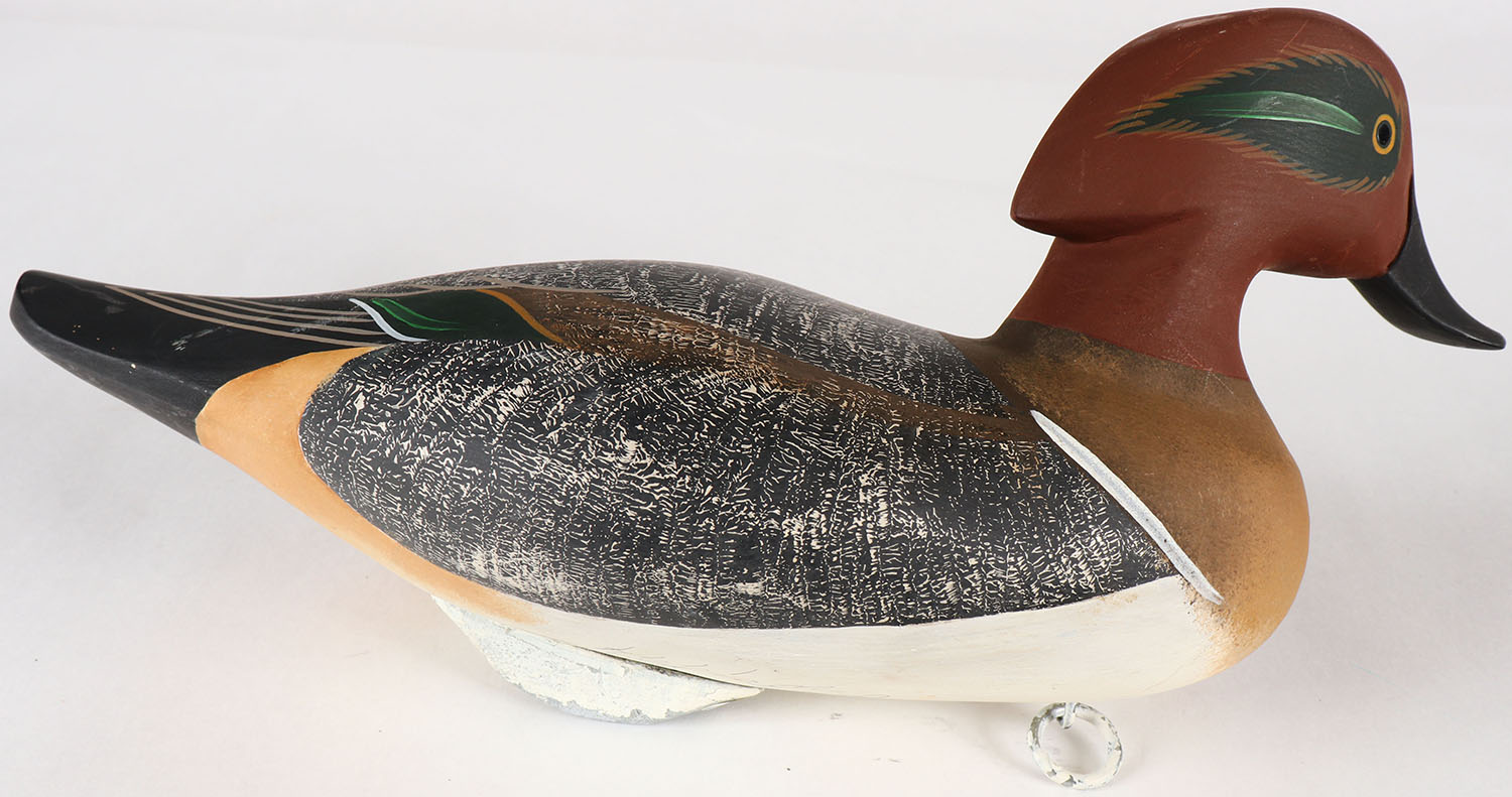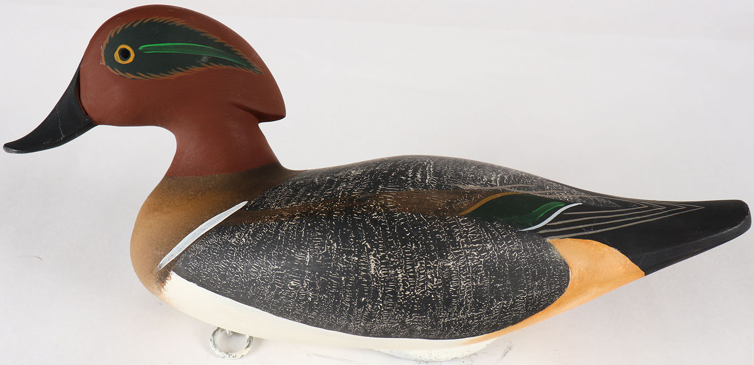 Greenwing Teal Drake on wood stand by John Meredith, Worton, MD. Glass eyes, solid wood, original paint, structurally excellent, 11 3/4'' OAL. Grade: MINT - Value: 50 to 100