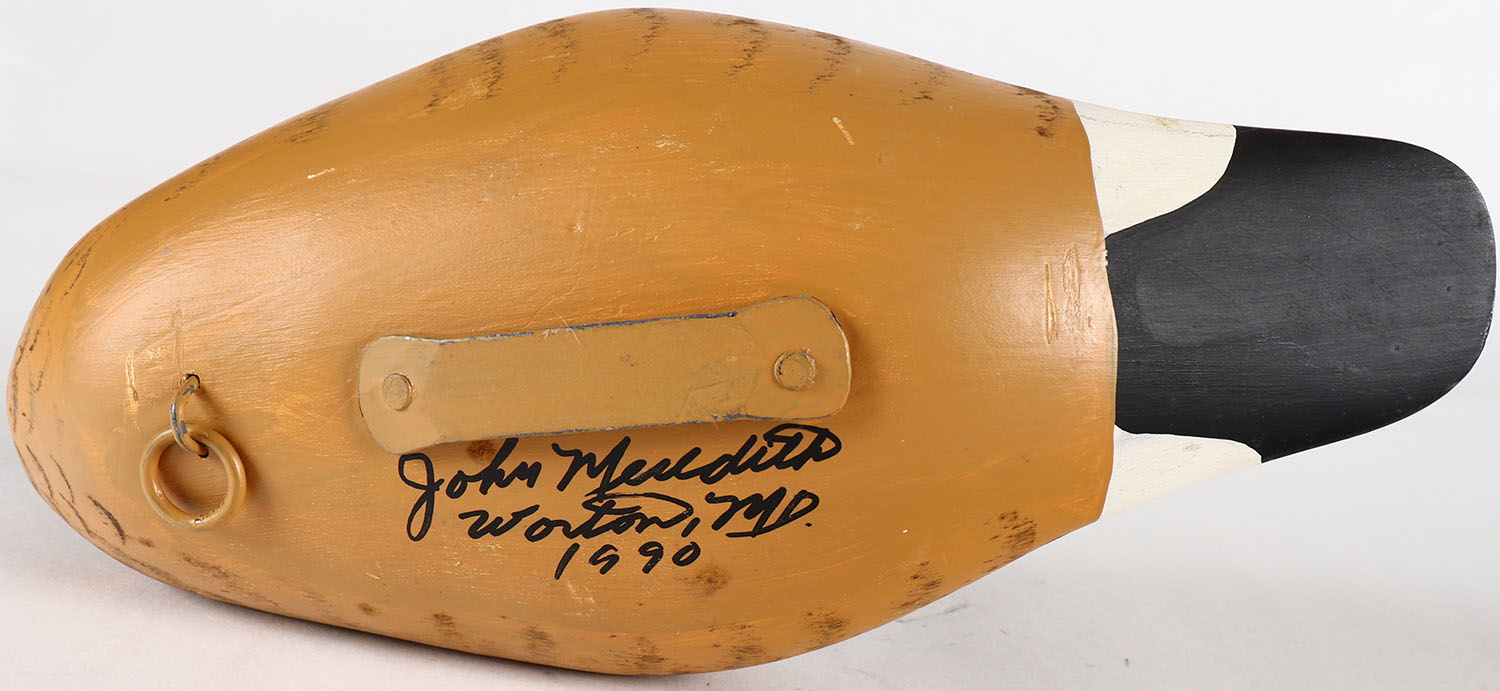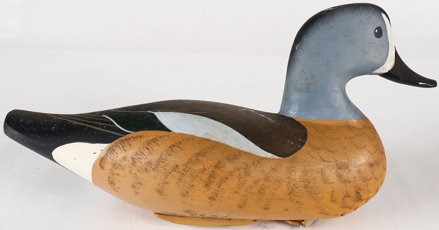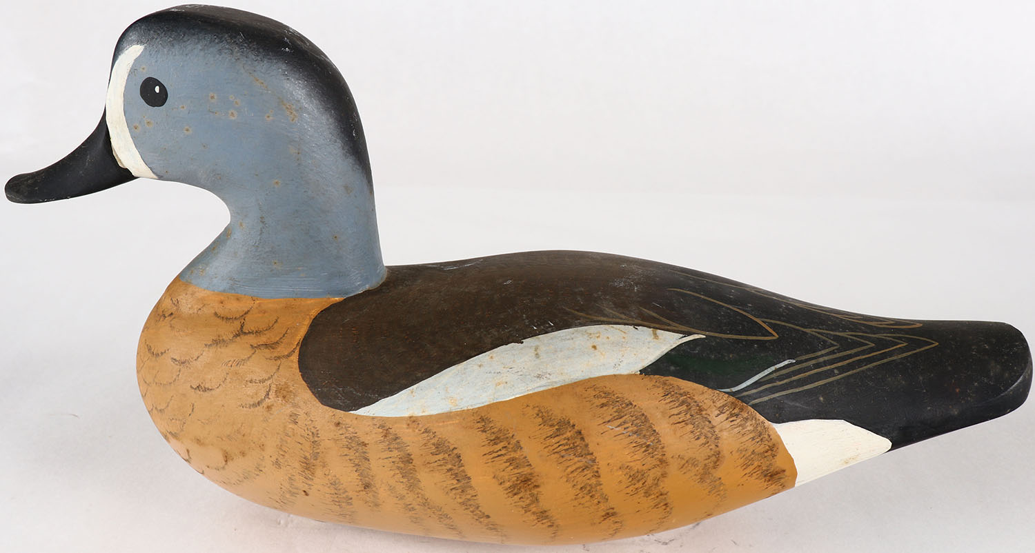 Bluewing Teal Drake on wood stand by John Meredith, Worton, MD. Painted eyes, solid wood, original paint, structurally excellent, 11 3/4'' OAL. Grade: MINT - Value: 50 to 100