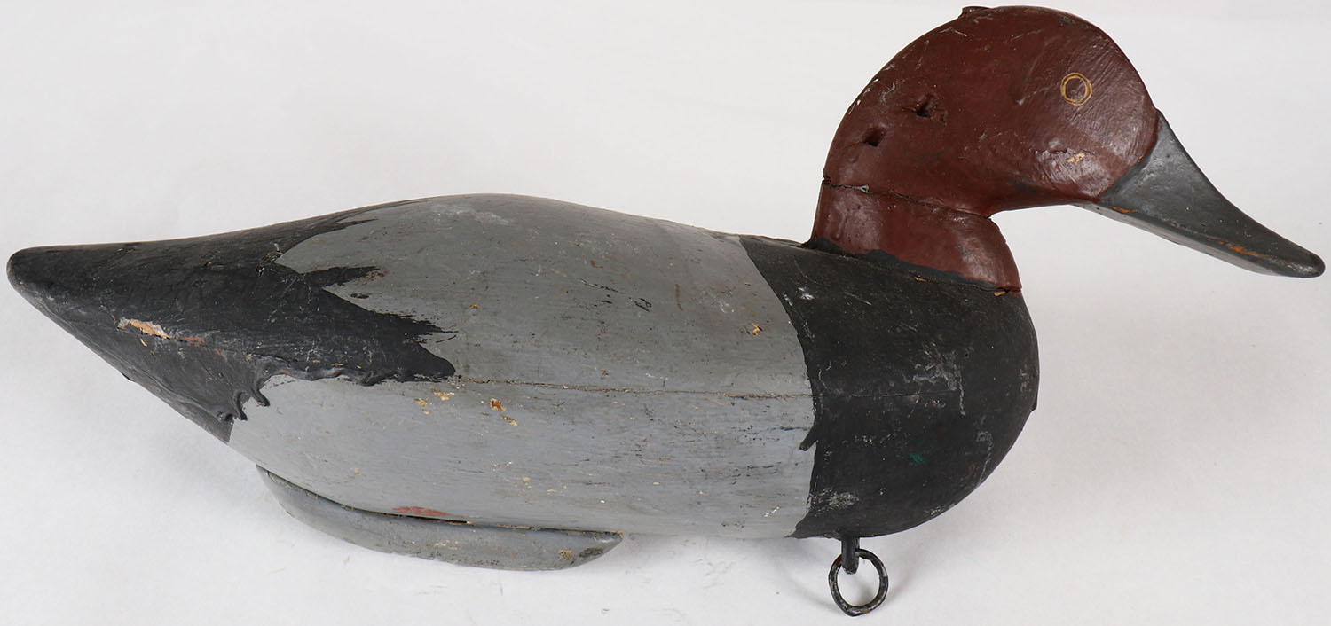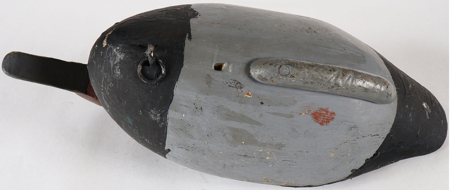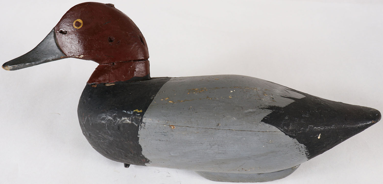 Redhead Drake decoy by MD unknown carver, PE, solid wood, old repaint, structurally excellent, 15'' OAL. Grade: Very Good ++ - Value: 20 to 40