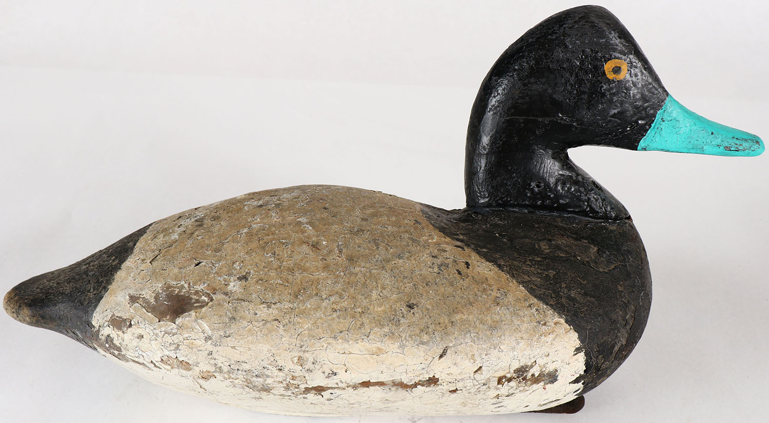 Bluebill Drake decoy by MD unknown carver, PE, solid wood, old repaint, structurally excellent, 13'' OAL. Grade: Very Good - Value: 20 to 40