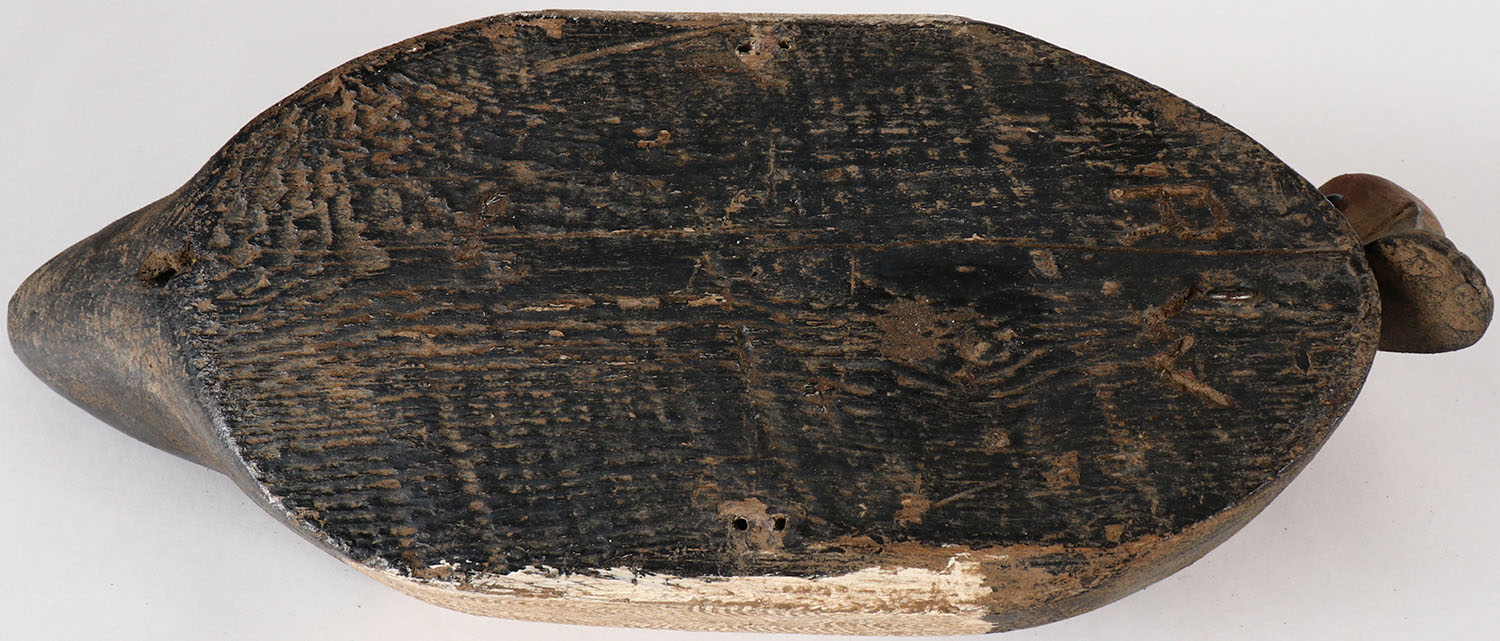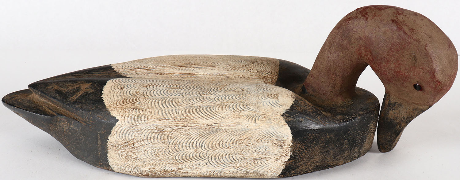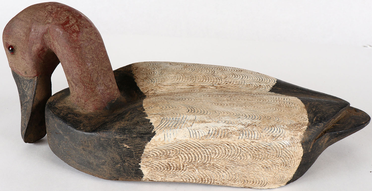 Preening Canvasback Drake by unknown carver, GE, solid wood, original comb paint (could use a little cleaning), structurally excellent, 15'' OAL. Grade: Excellent - Value: 20 to 40