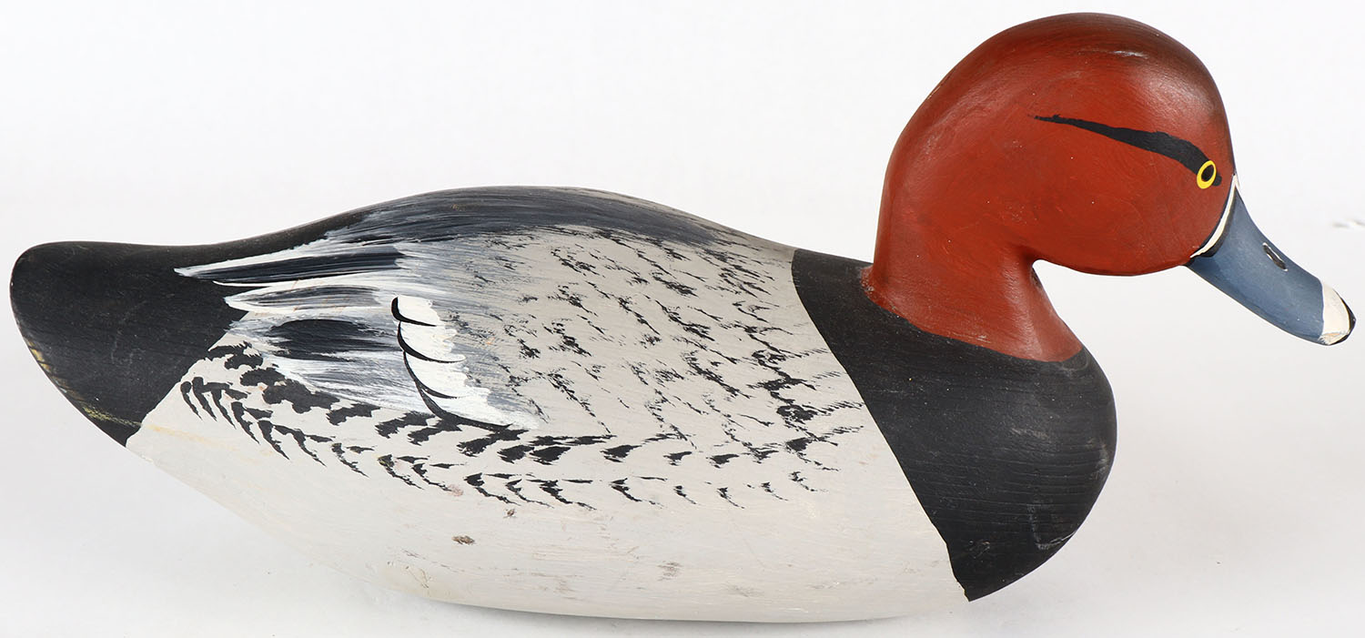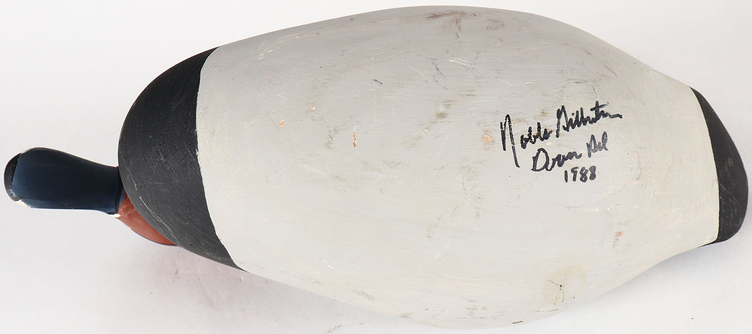 Redhead Drake by Nobel Gilbertson, Dover, DE, painted eyes, solid wood, original paint, structurally excellent, signed on bottom, 14'' OAL. Grade: Excellent ++ - Value: 30 to 60