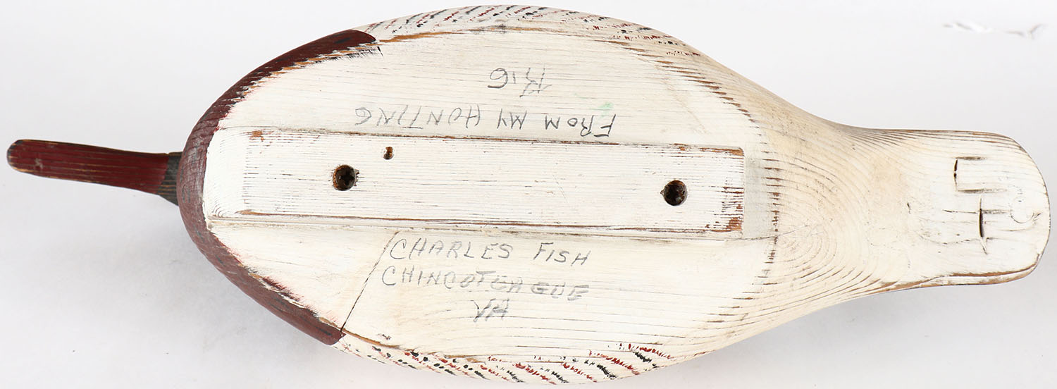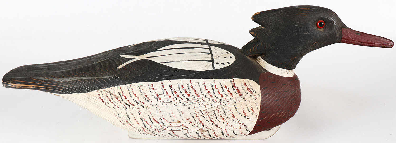 Hooded Merganser by Charles Fish, Chincoteague, VA, ''FROM MY HUNTING RIG'', GE, solid wood, nice original paint. Grade: Excellent - Value: 100 to 400