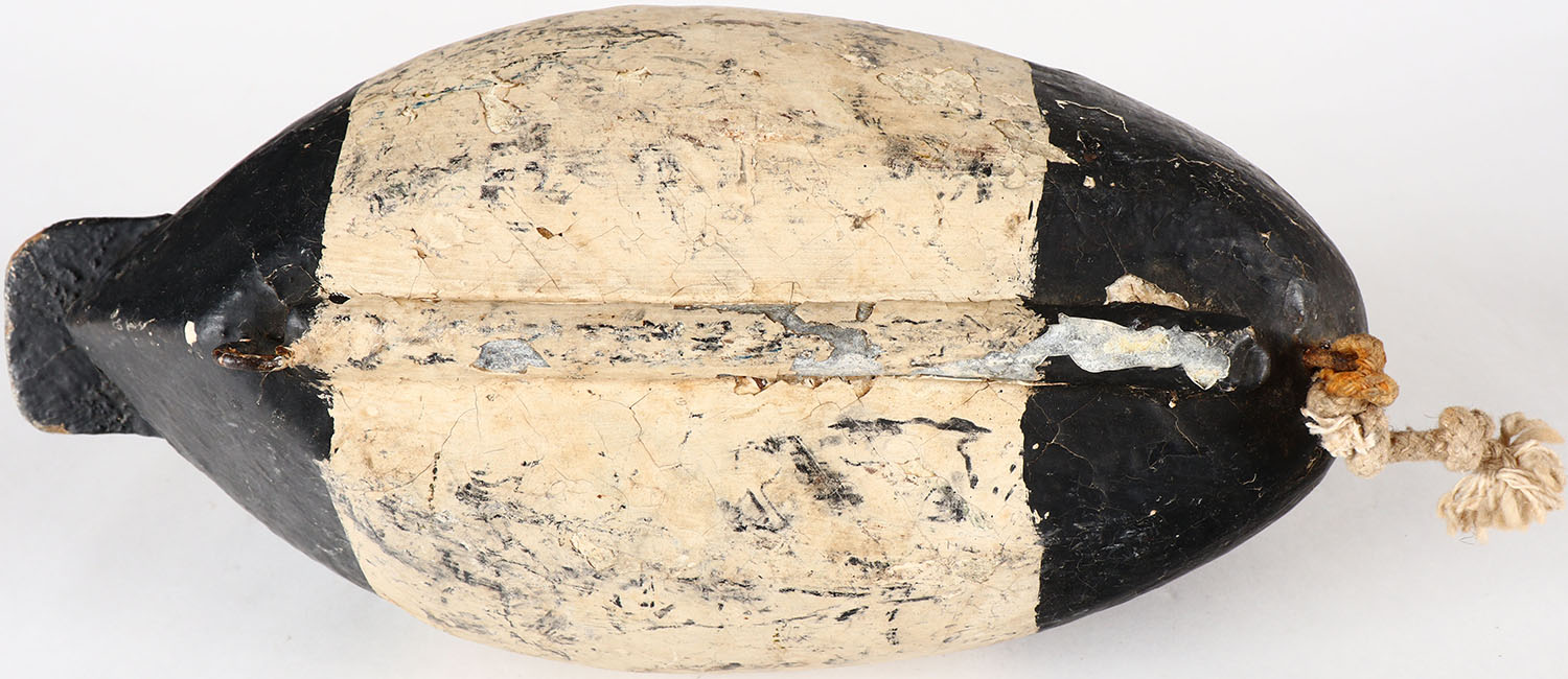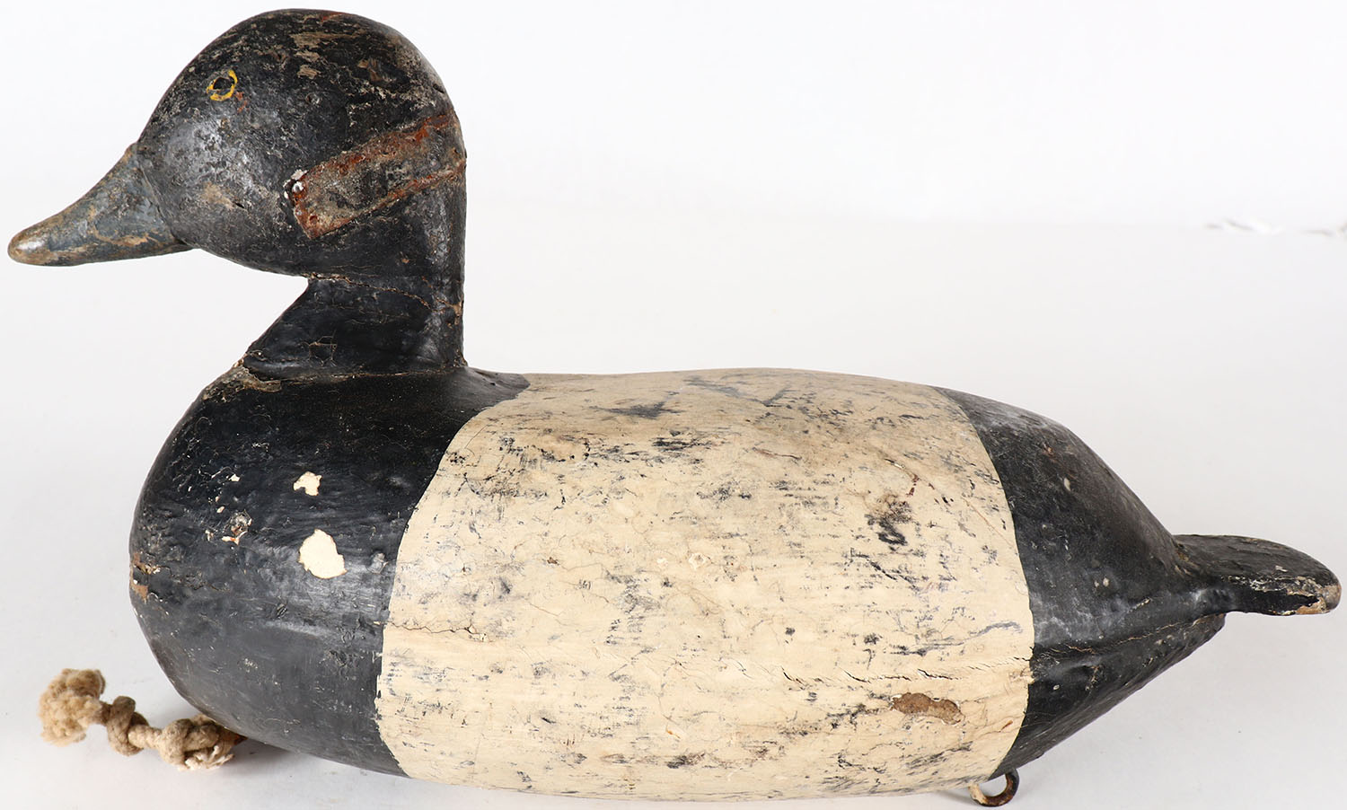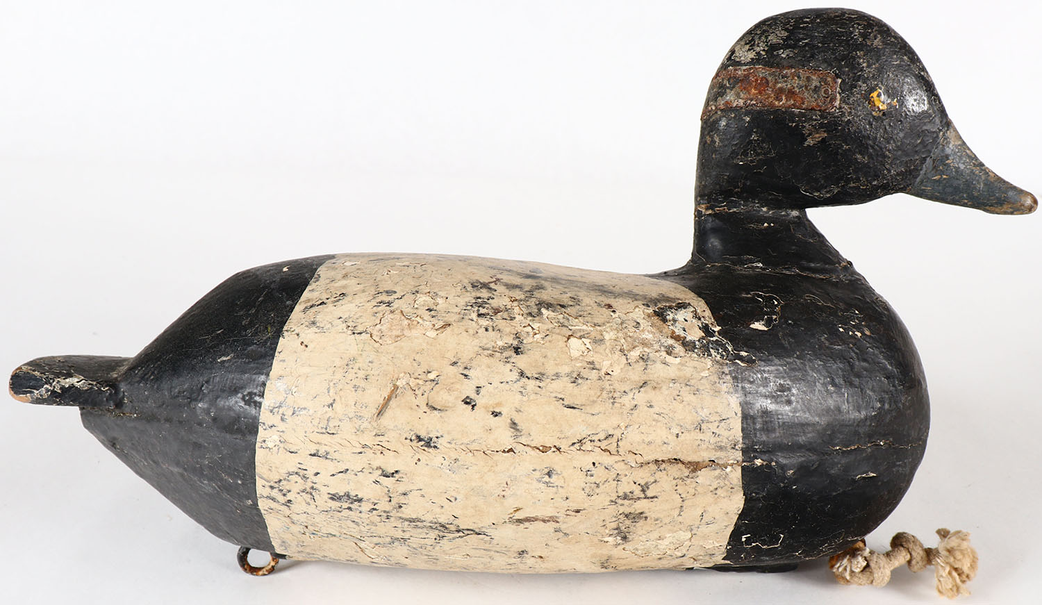 Bluebill Drake by unknown maker, PE, solid wood, old repaint shows wear, has lead strap to back of head. Grade: Very Good ++ - Value: 20 to 40