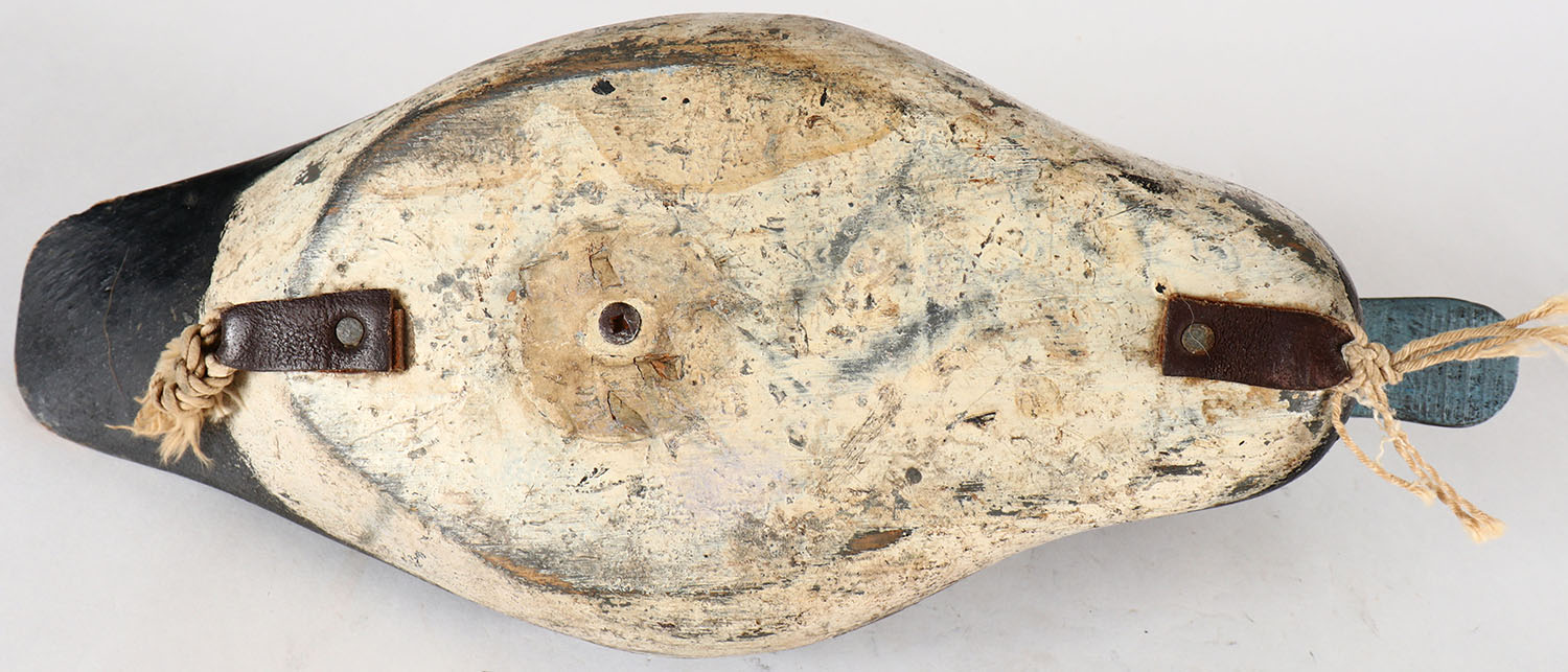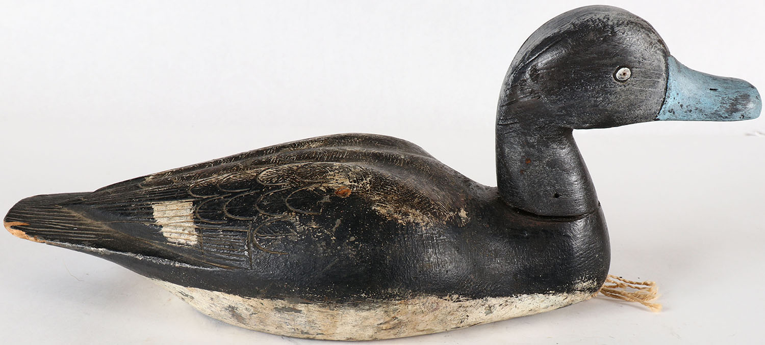 Bluebill Drake by unknown maker, PE, solid wood, original paint, structurally excellent, has feather carvings. Grade: Excellent - Value: 10 to 30