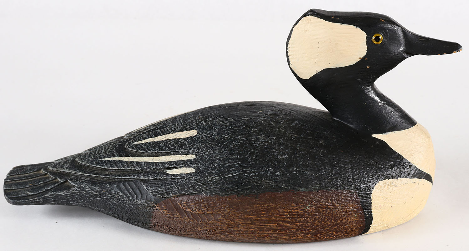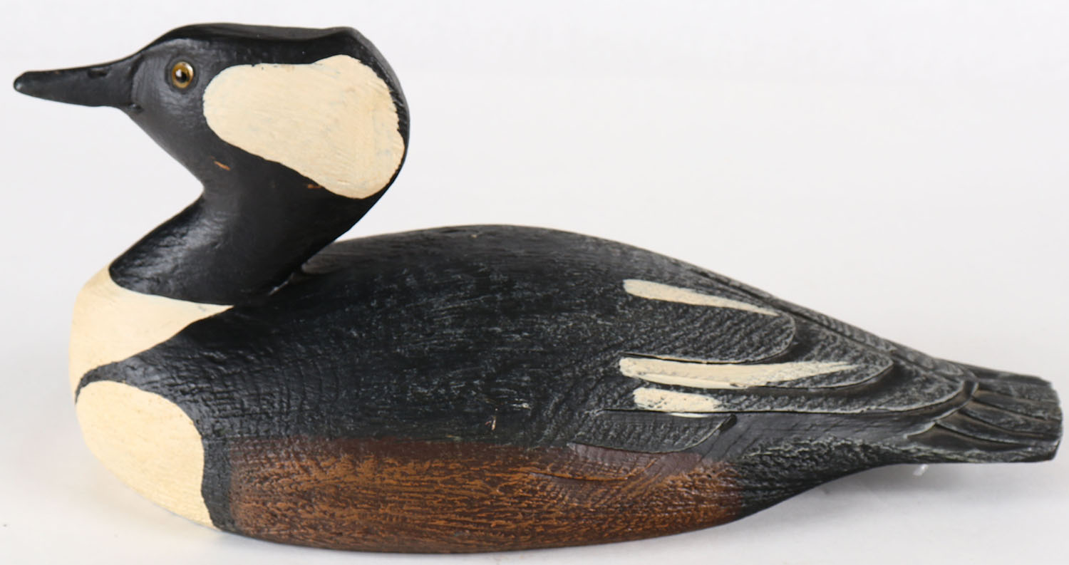 Hooded Merganser Drake by Tom Martindale, Ontario, Canada, glass eyes, solid wood, original paint, structurally excellent, branded TM on bottom. Grade: Excellent ++ - Value: 20 to 50