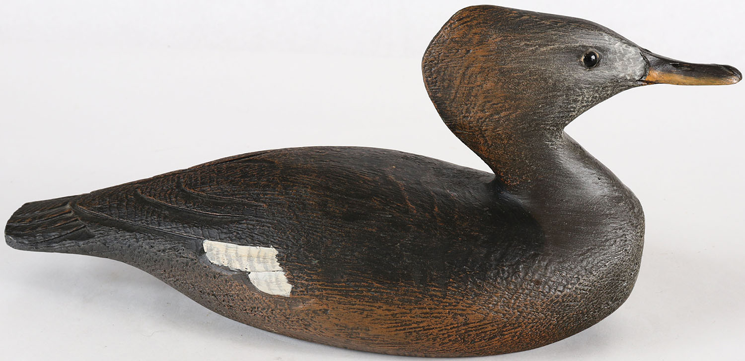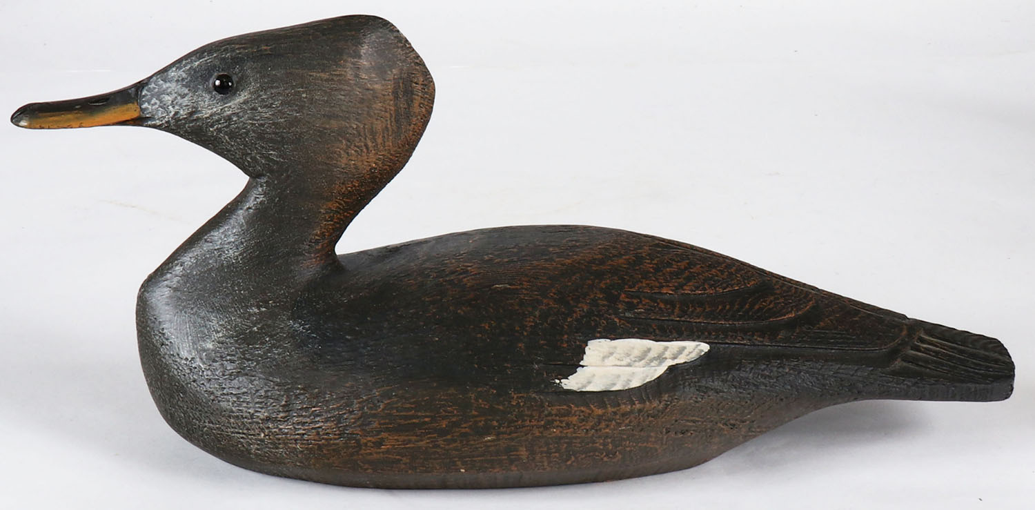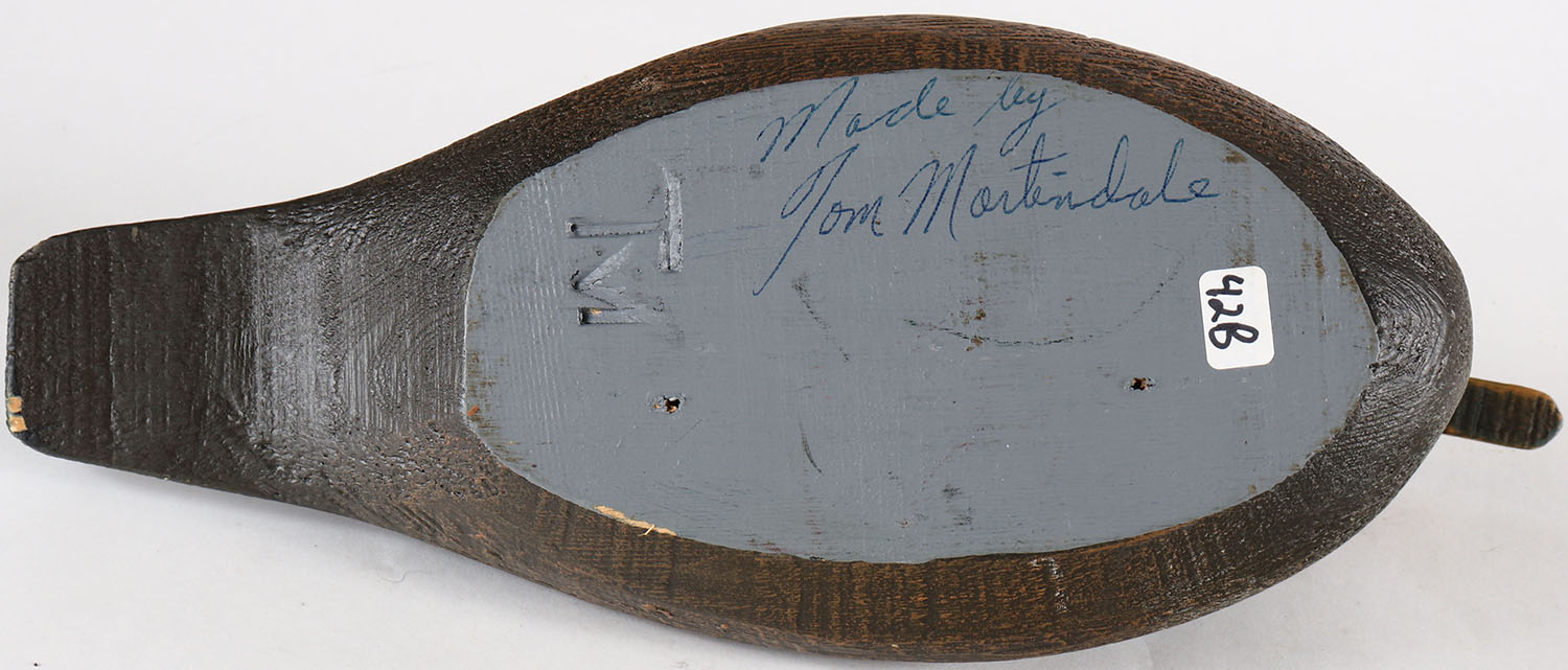 Hooded Merganser Drake by Tom Martindale, Ontario, Canada, glass eyes, solid wood, original paint, structurally excellent, branded TM on bottom. Grade: Excellent ++ - Value: 20 to 50