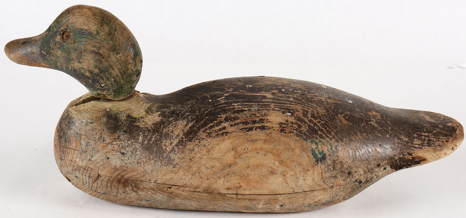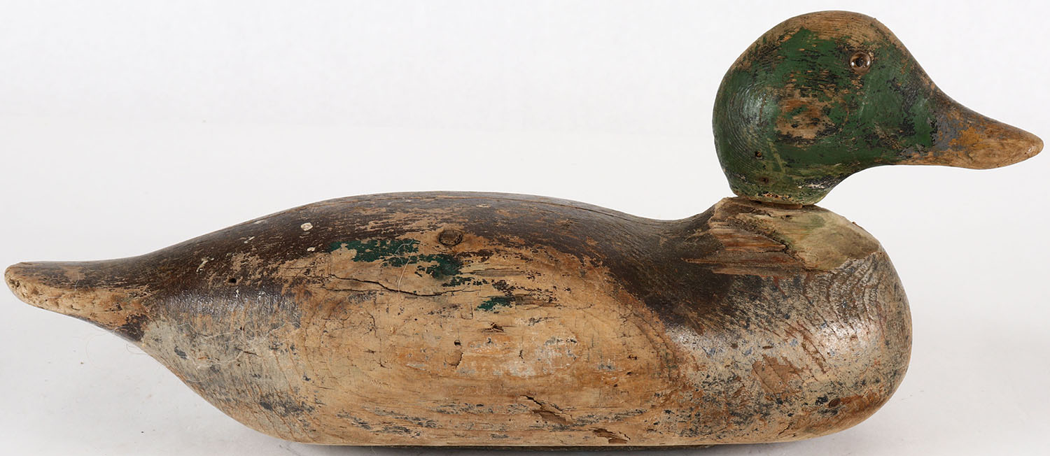 Mallard Drake by Mason Decoy Company, Detroit, MI, 1896-1924, Standard Grade, glass eyes one missing, solid wood, original paint, head swives. Grade: Very Good - Value: 20 to 60